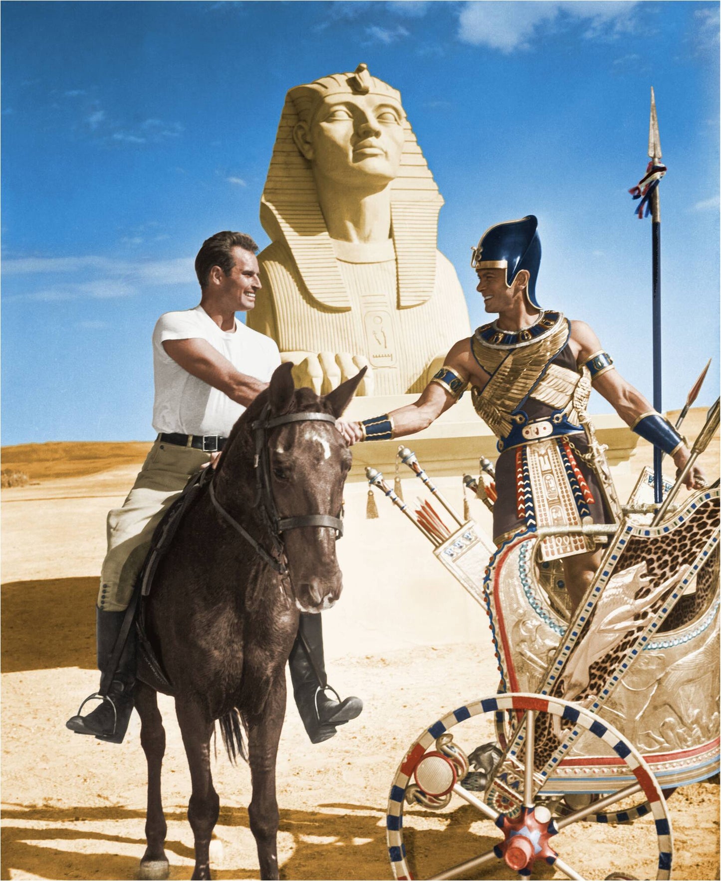 Fantastische neu kolorierte Aufnahme einer Szene aus dem Film „Die zehn Gebote“ von Cecil B. DeMille aus dem Jahr 1956 mit Charlton Heston und Yul Brynner in den Hauptrollen.