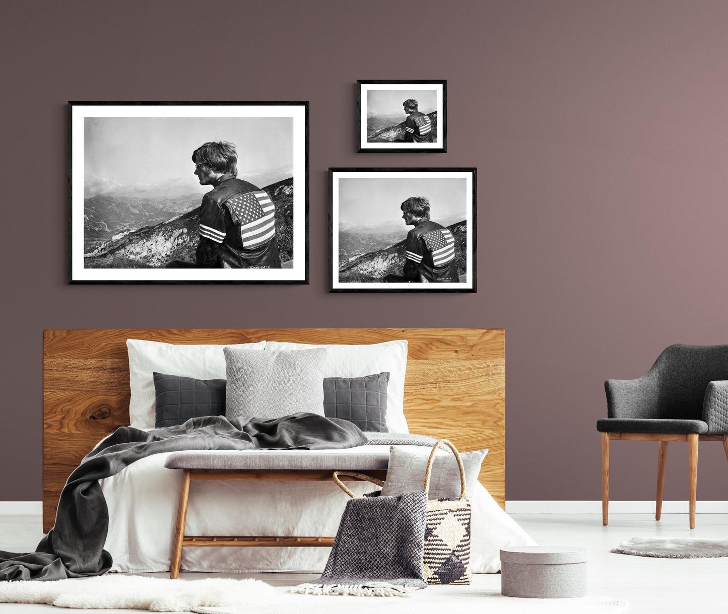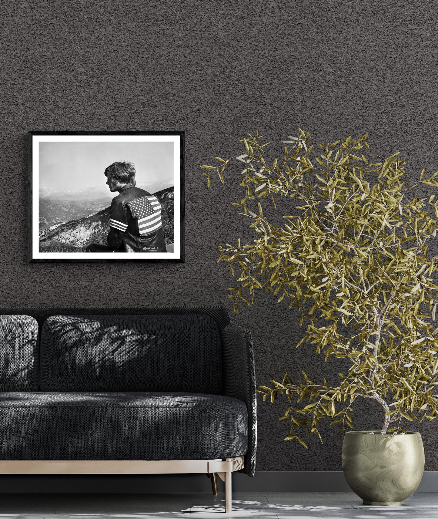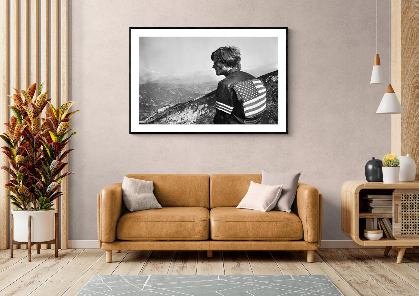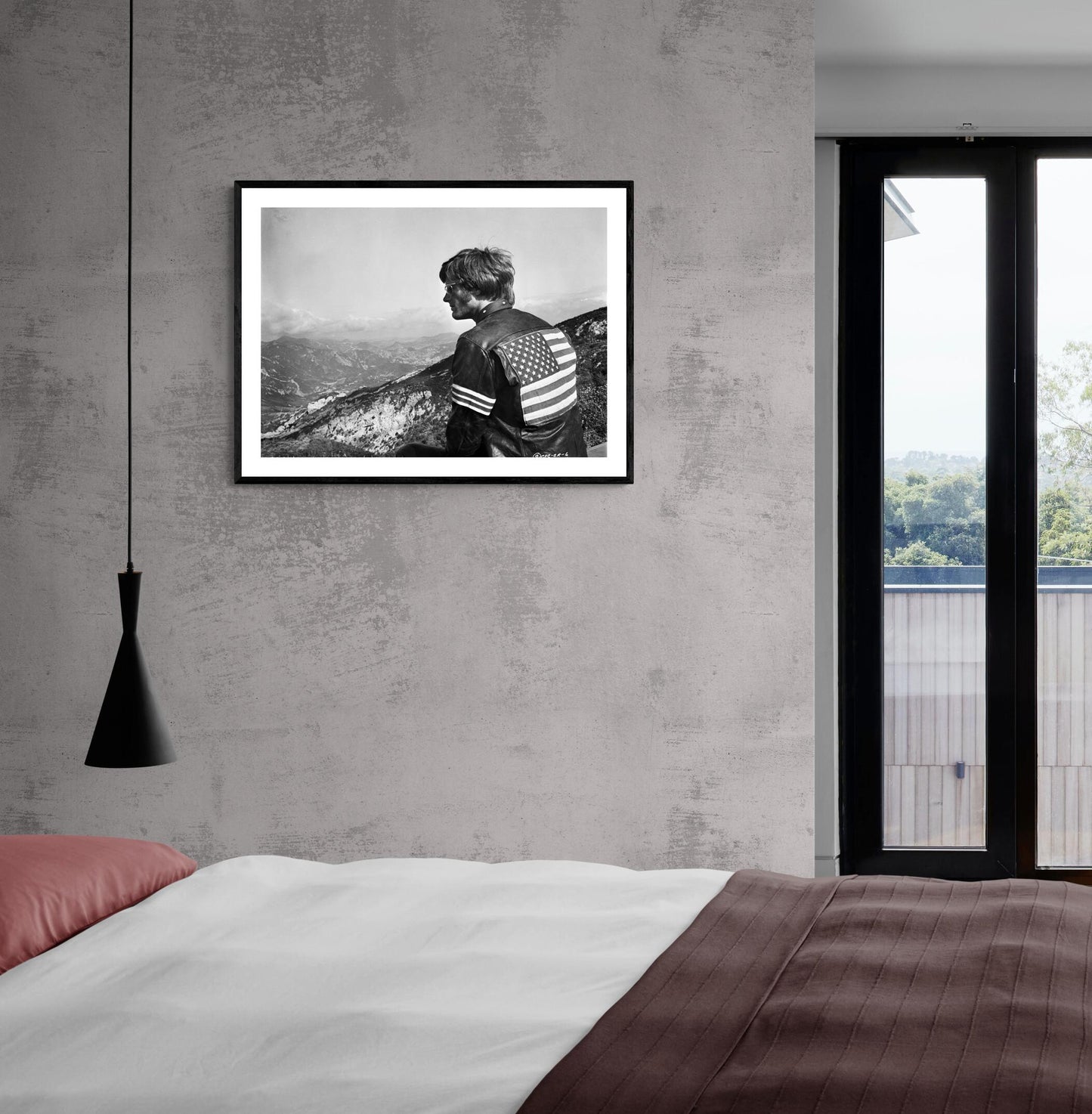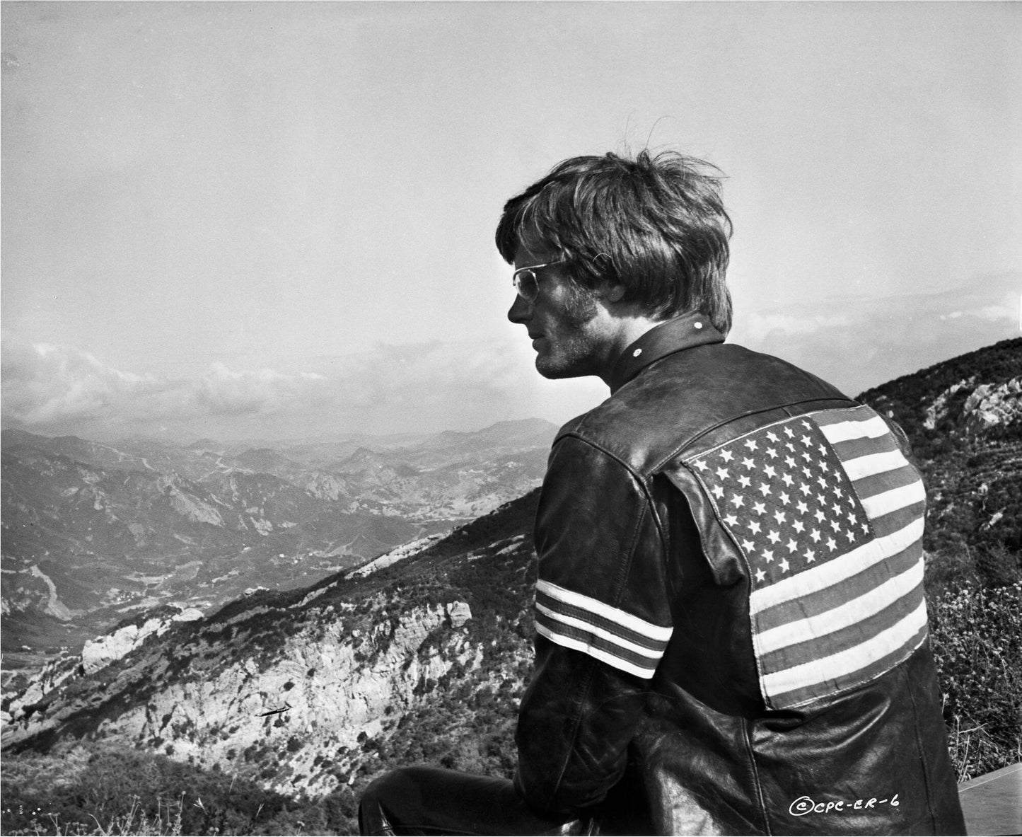 Dieses Schwarzweißporträt zeigt die Schauspielerin Peter Fonda in „Easy Rider“, die auf die Berge blickt und eine Lederjacke mit einer amerikanischen Flagge darauf trägt.