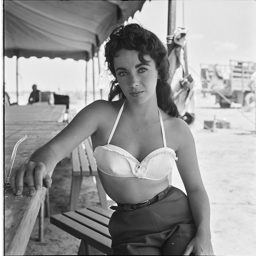 Dieses ikonische und elegante Porträt des Starfotografen Frank Worth zeigt die Schauspielerin Elizabeth Taylor am Set des Films „Giant“ in ihrer Rolle als Leslie Benedict. Diese Schwarzweiß-Halbfigur zeigt die Schauspielerin in einem weißen Bikinioberteil hinter den Kulissen.