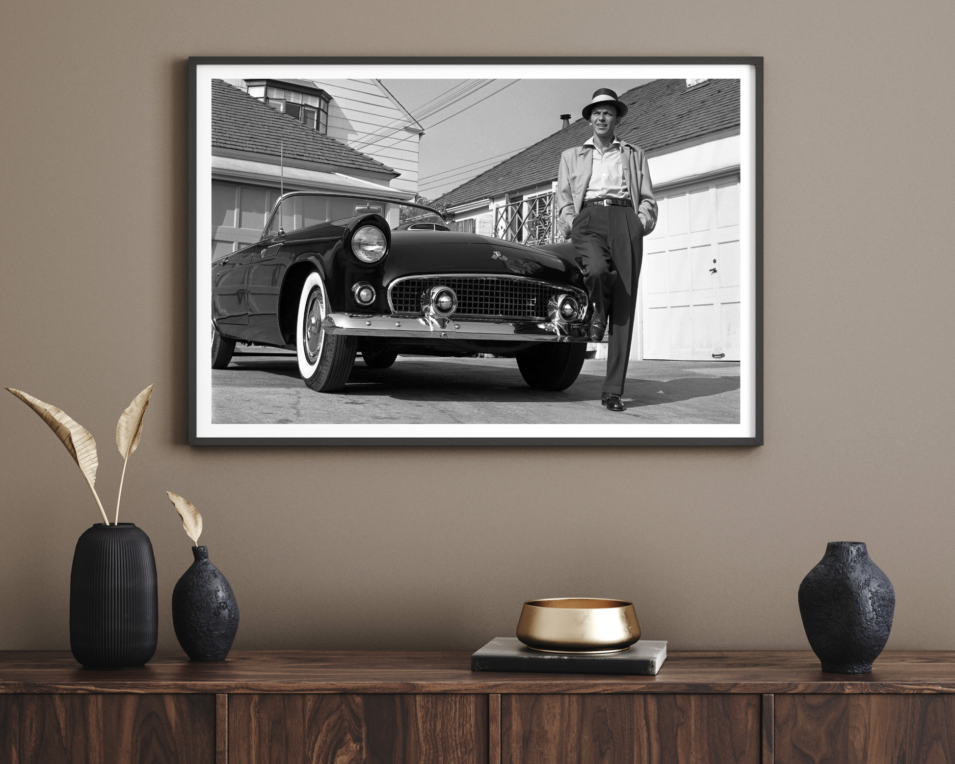 Black-and-white image of Frank Sinatra leaning casually against a Ford Thunderbird, exuding cool confidence in a fedora and relaxed attire. The stylish car and classic pose highlight the glamour of mid-century Hollywood.