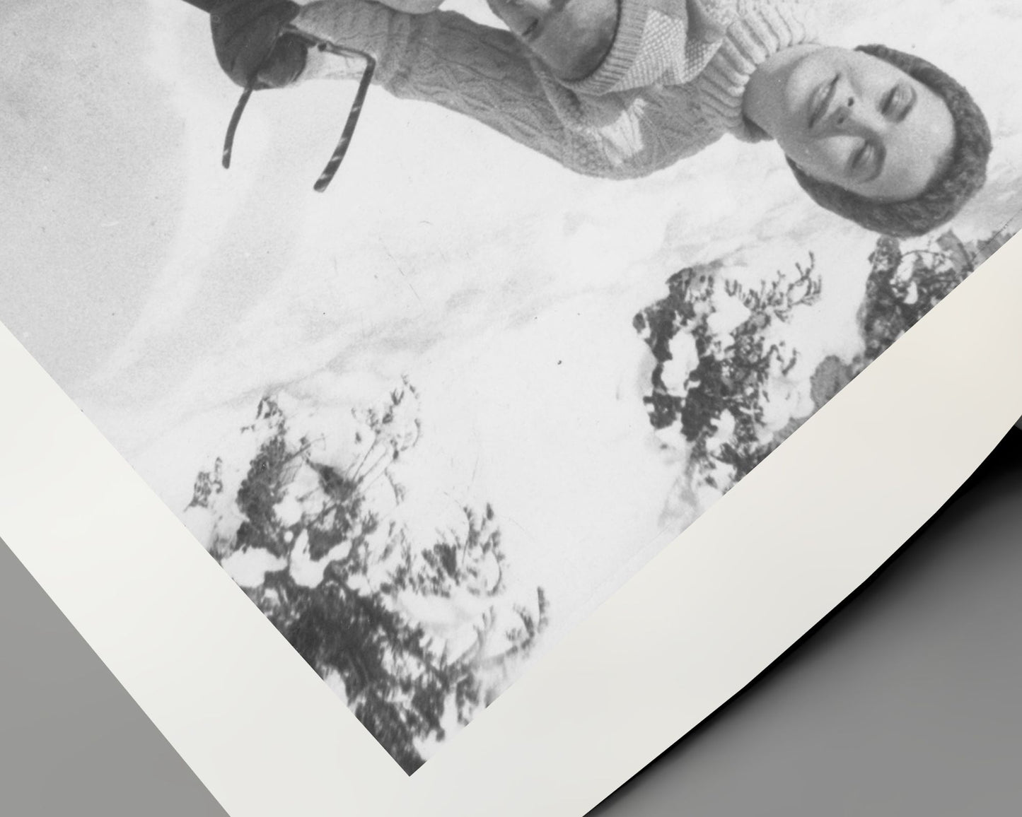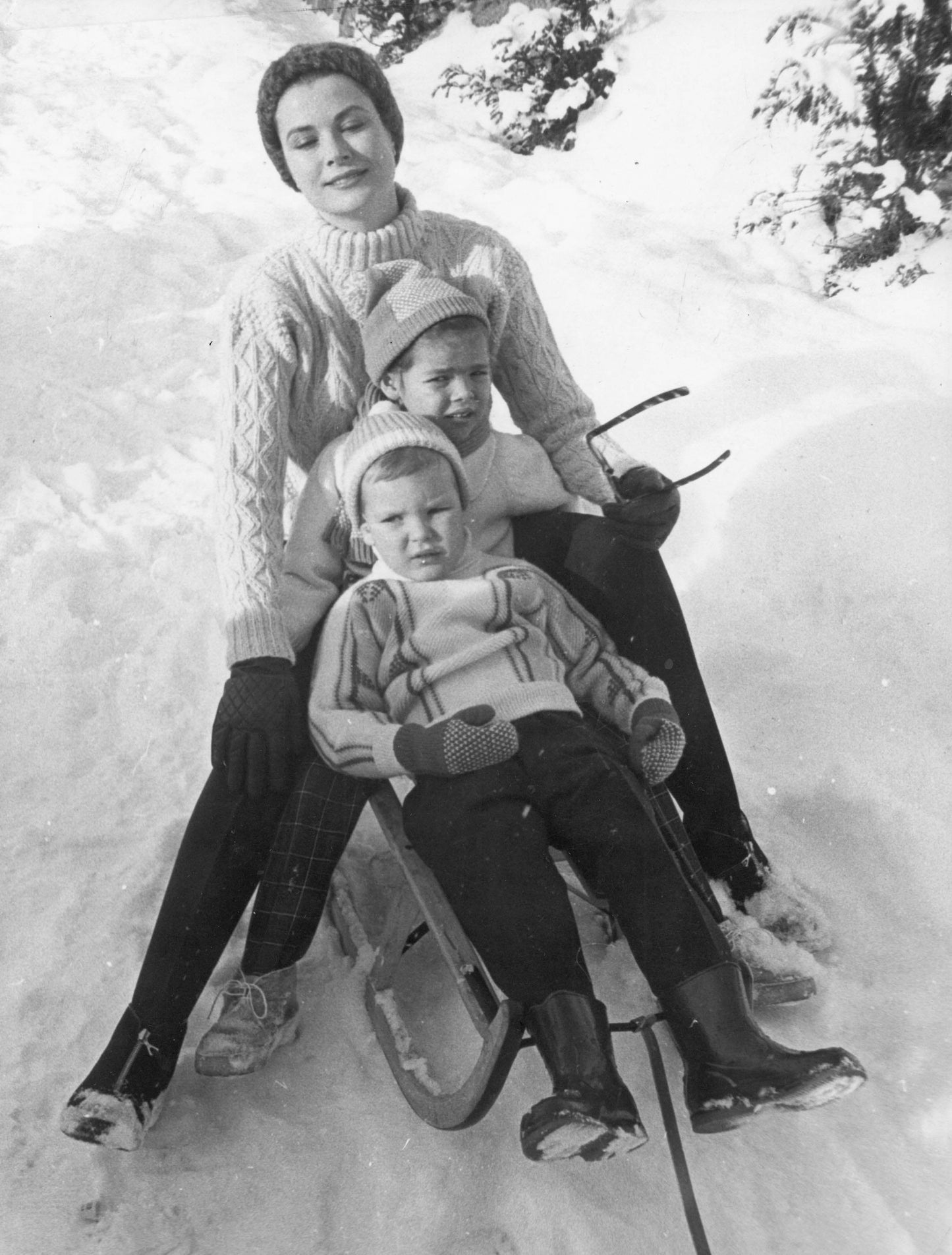 Black and white action shot of Grace Kelly sledding with her children in Switzerland, circa 1962.