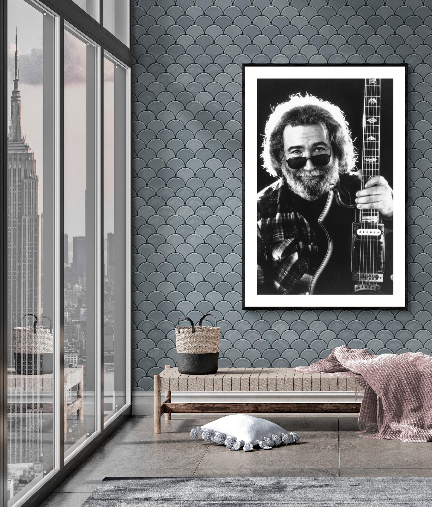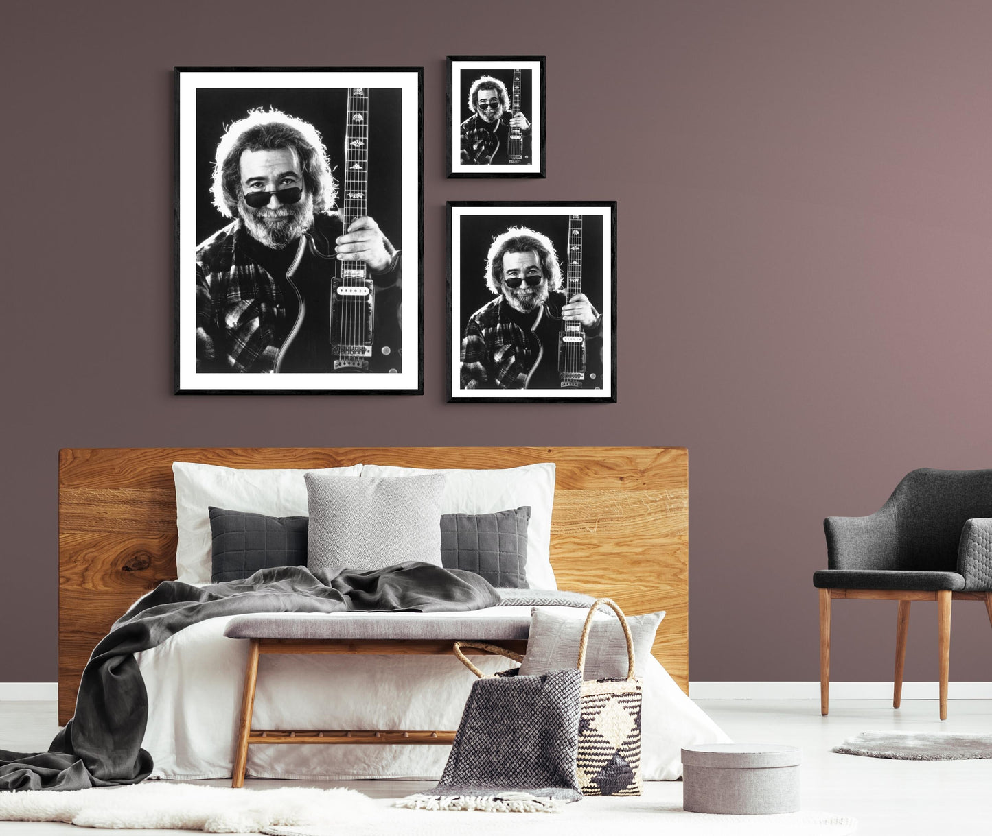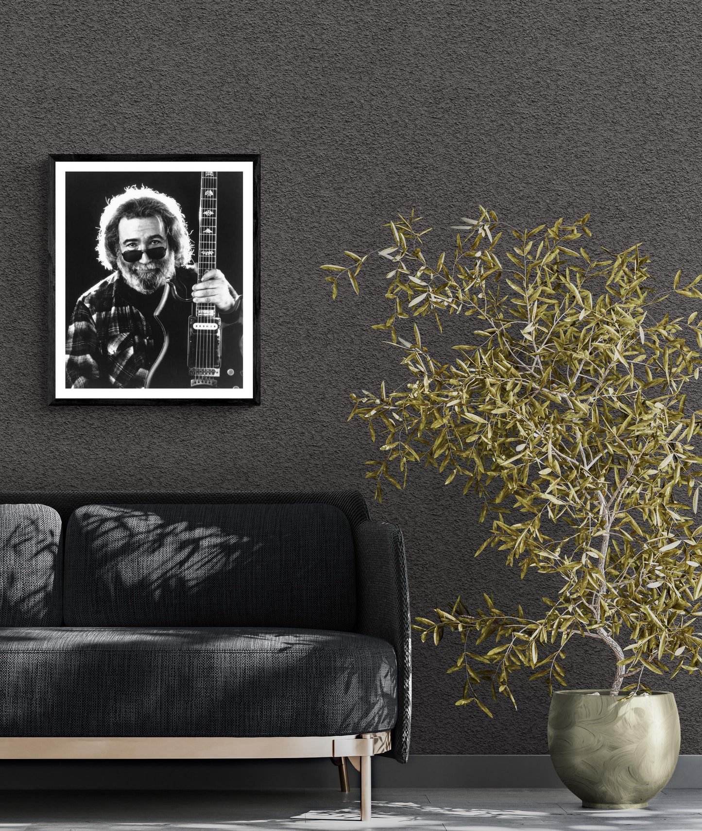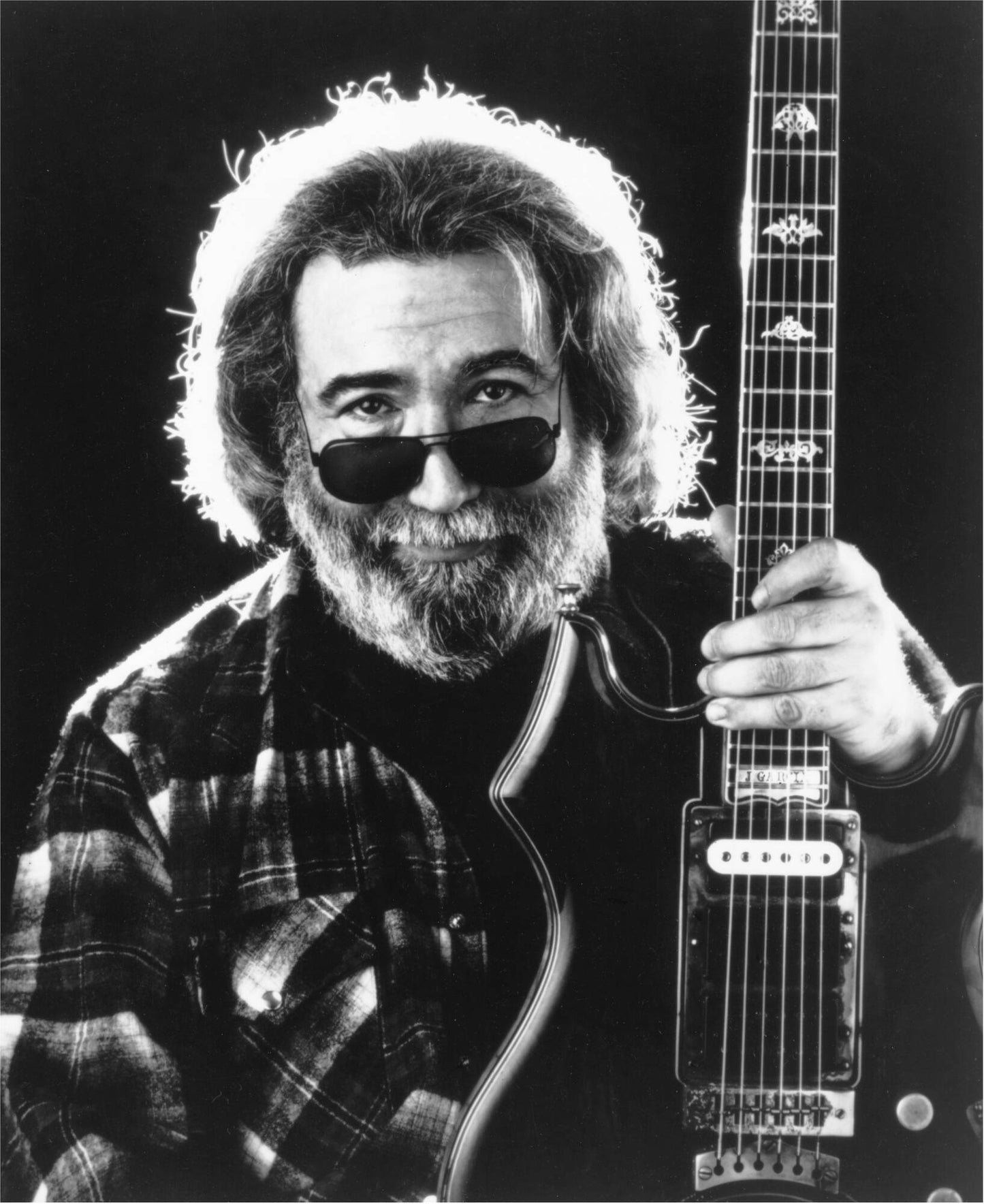 Studioporträt von Jerry Garcia mit Gitarre.