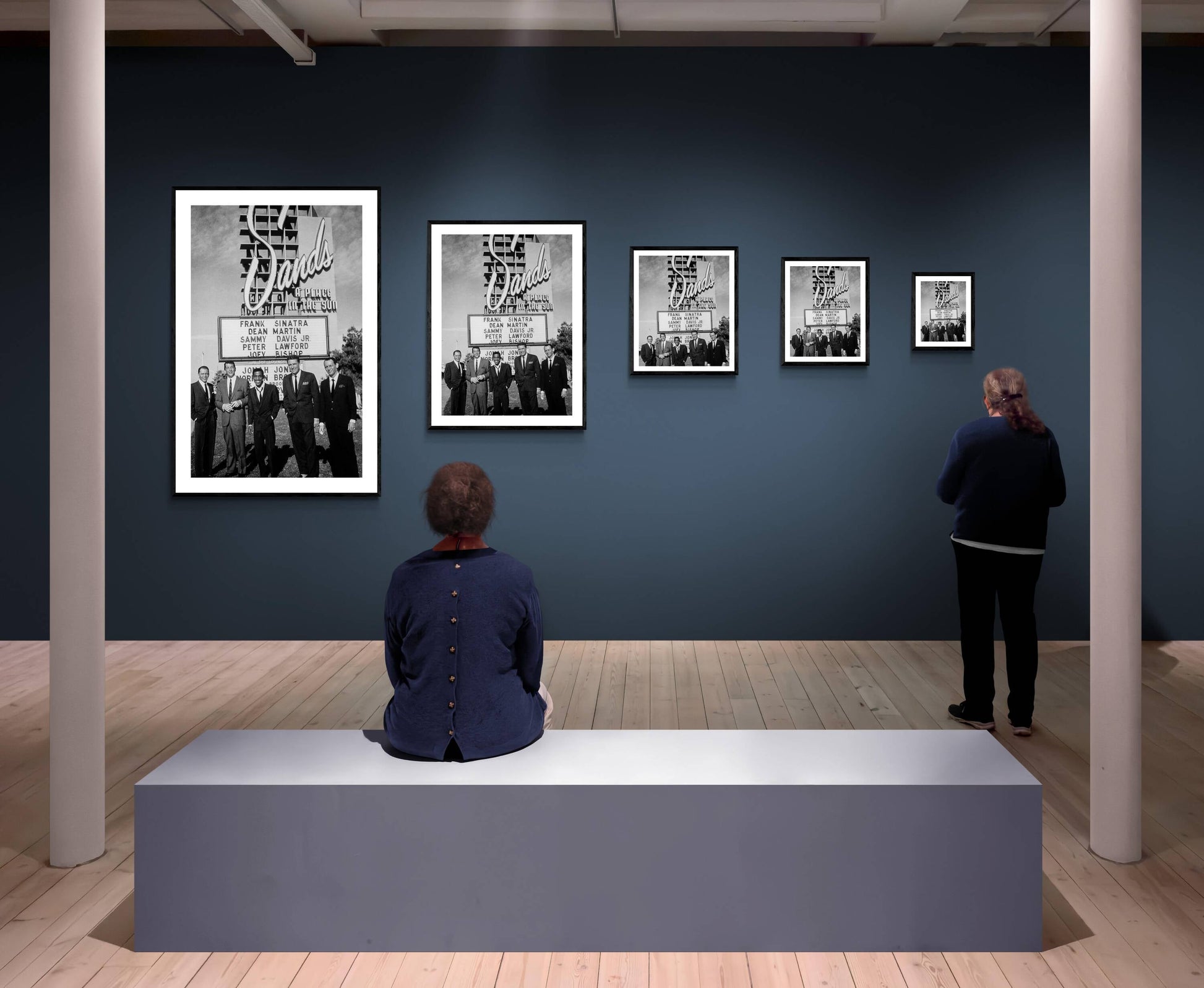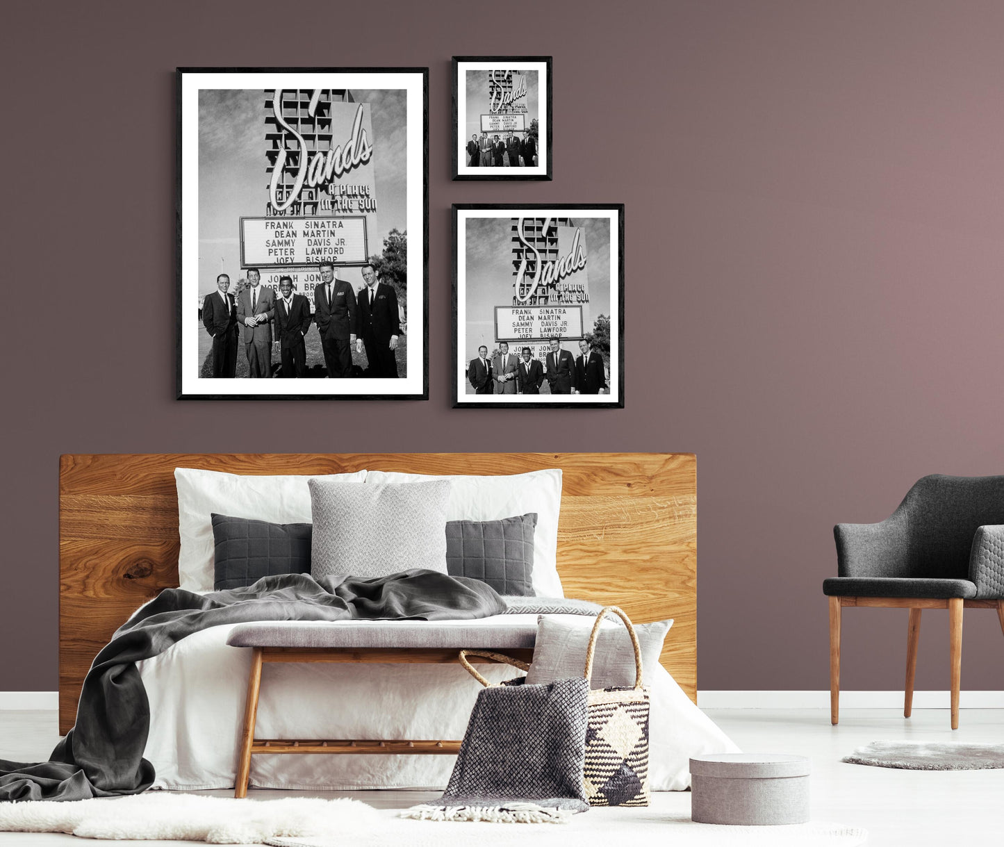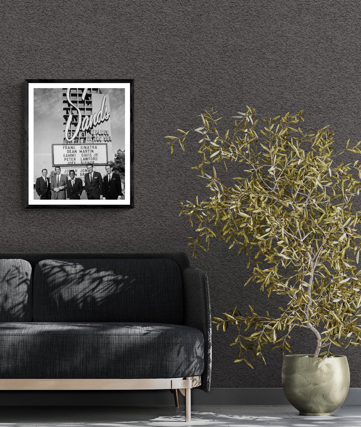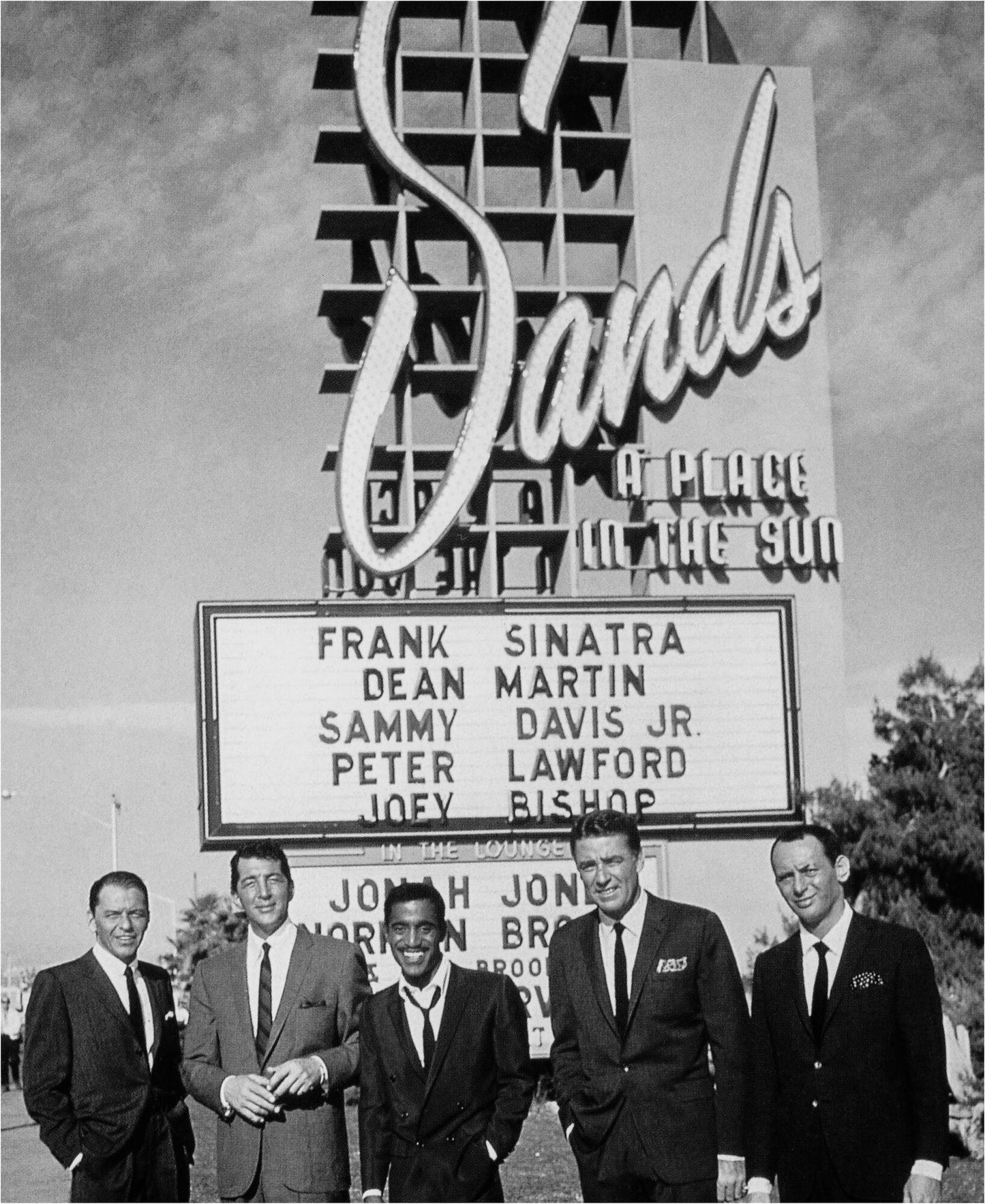 Seltenes Porträt des Rat Packs vor dem Schild des Sands Hotels, 1963.