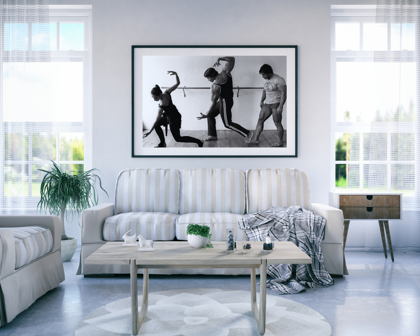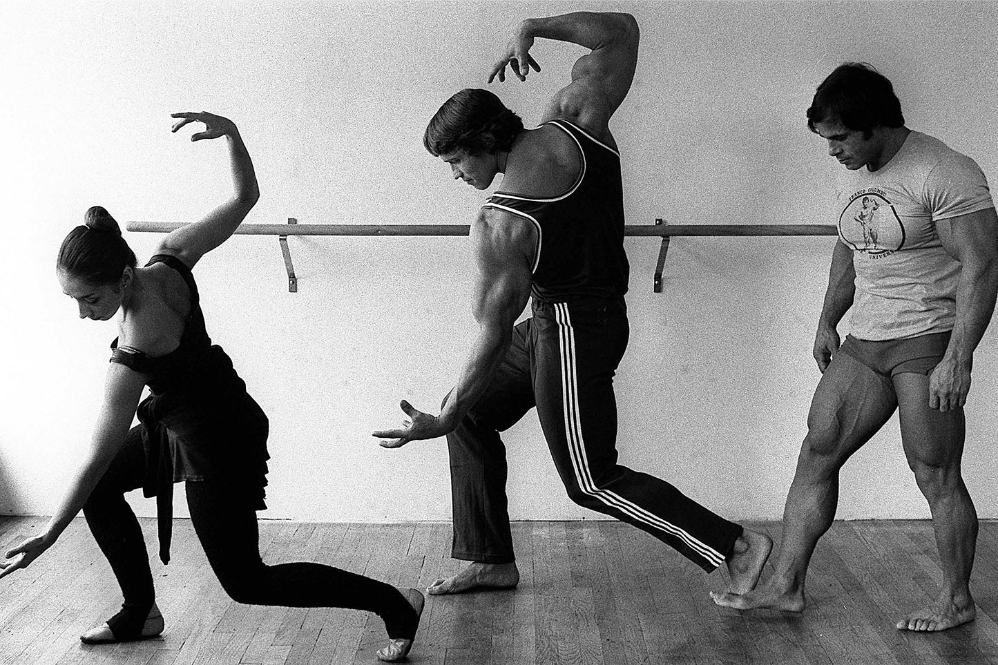 L'acteur et culturiste Arnold Schwarzenegger pratiquant le ballet avec un entraîneur, vers 1976.