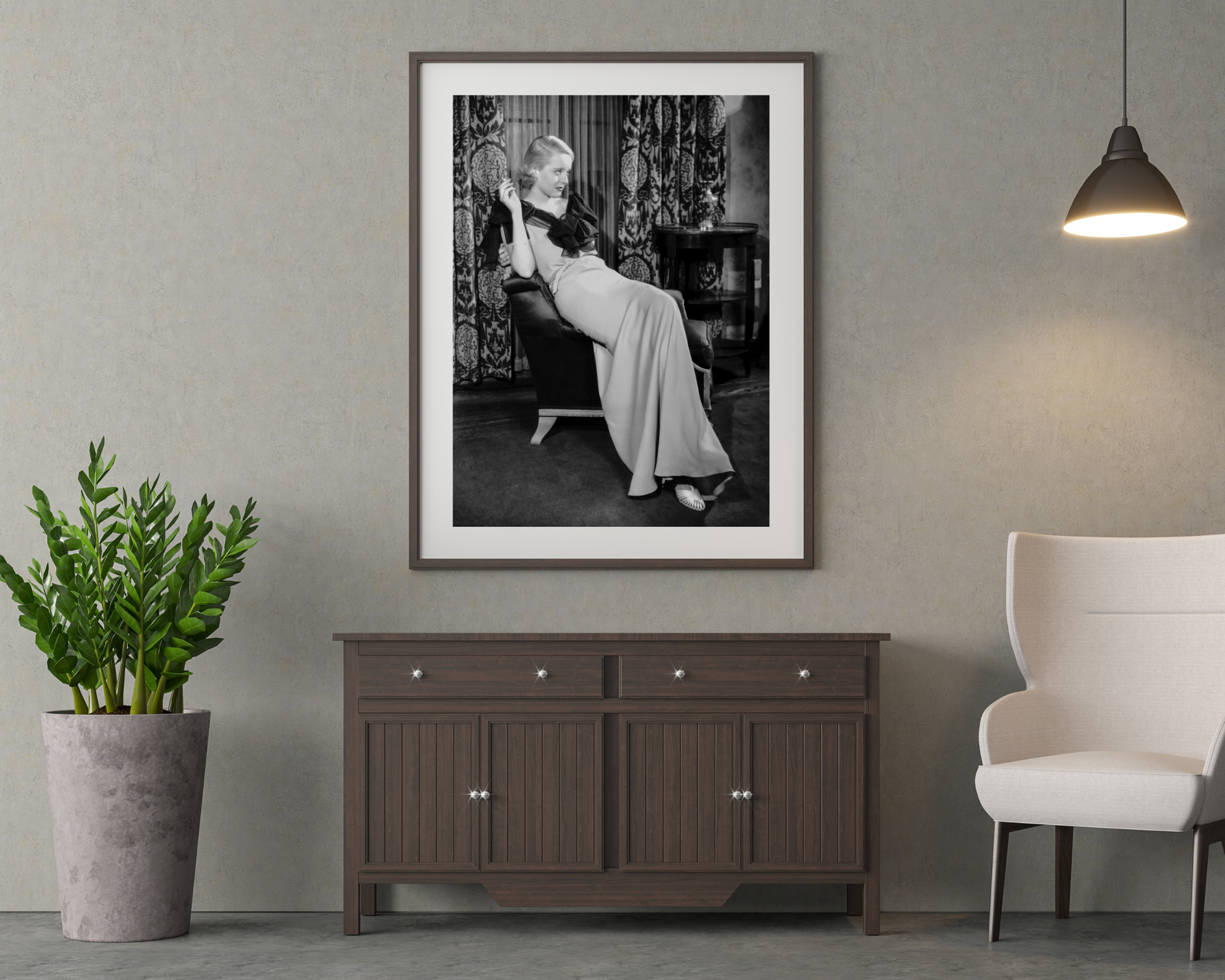 Superbe image en noir et blanc de Bette Davis dans une robe en soie, allongée tout en fumant une cigarette.