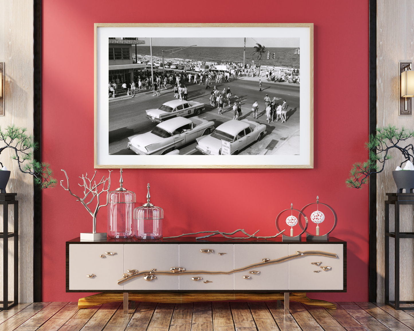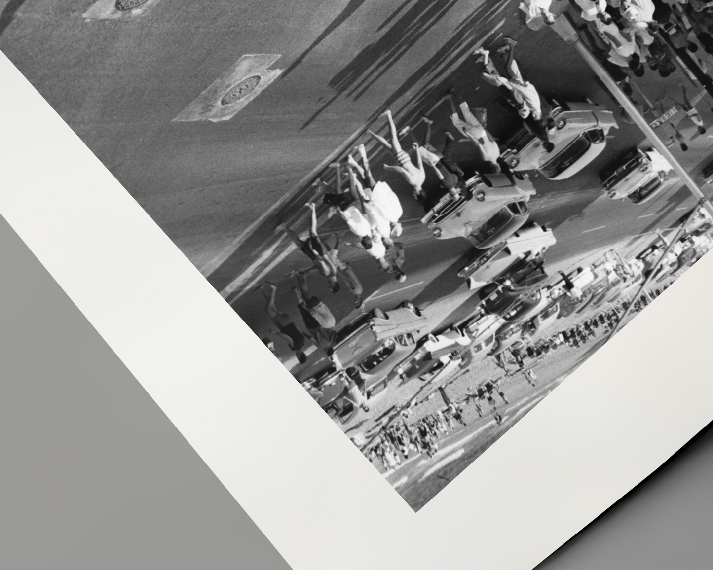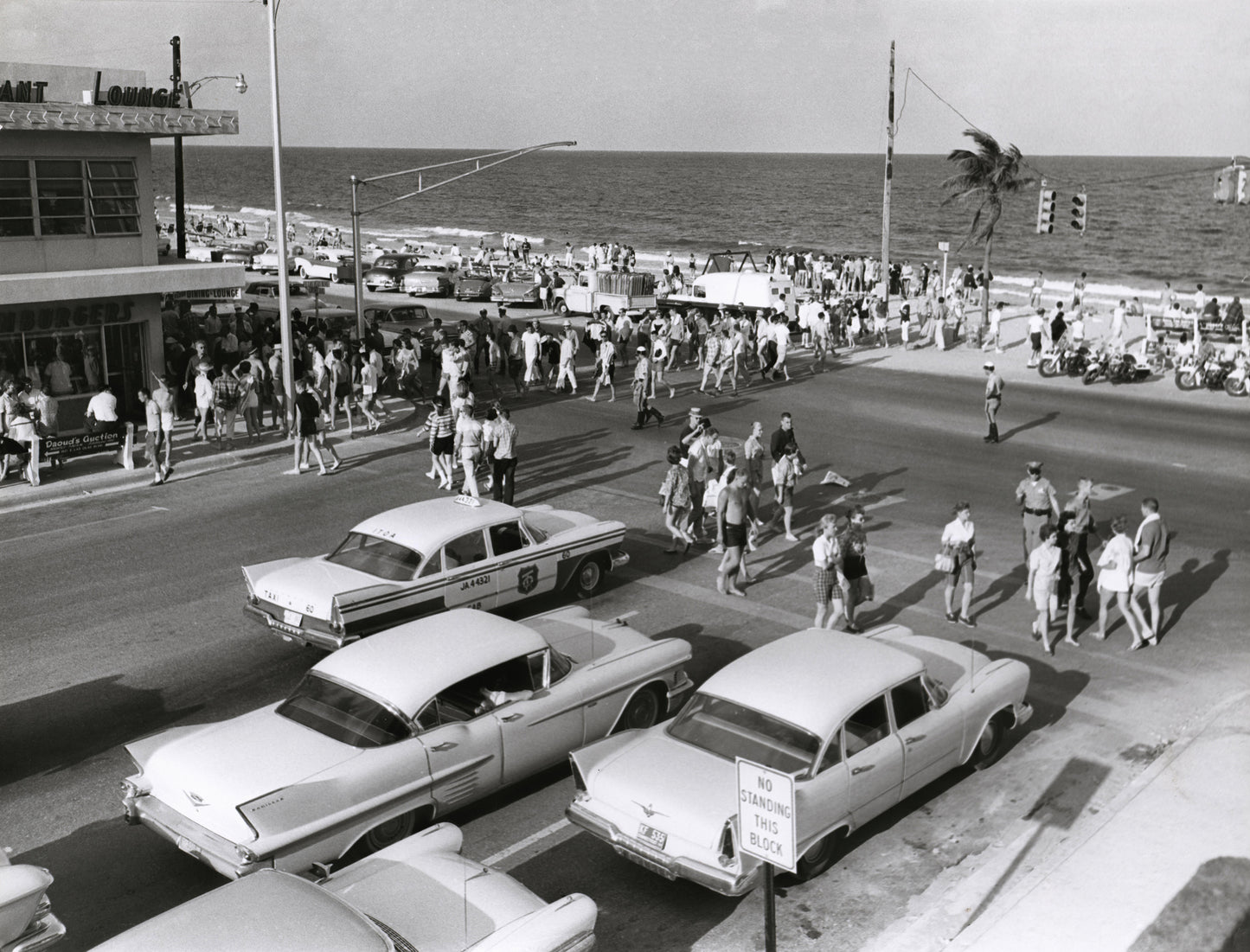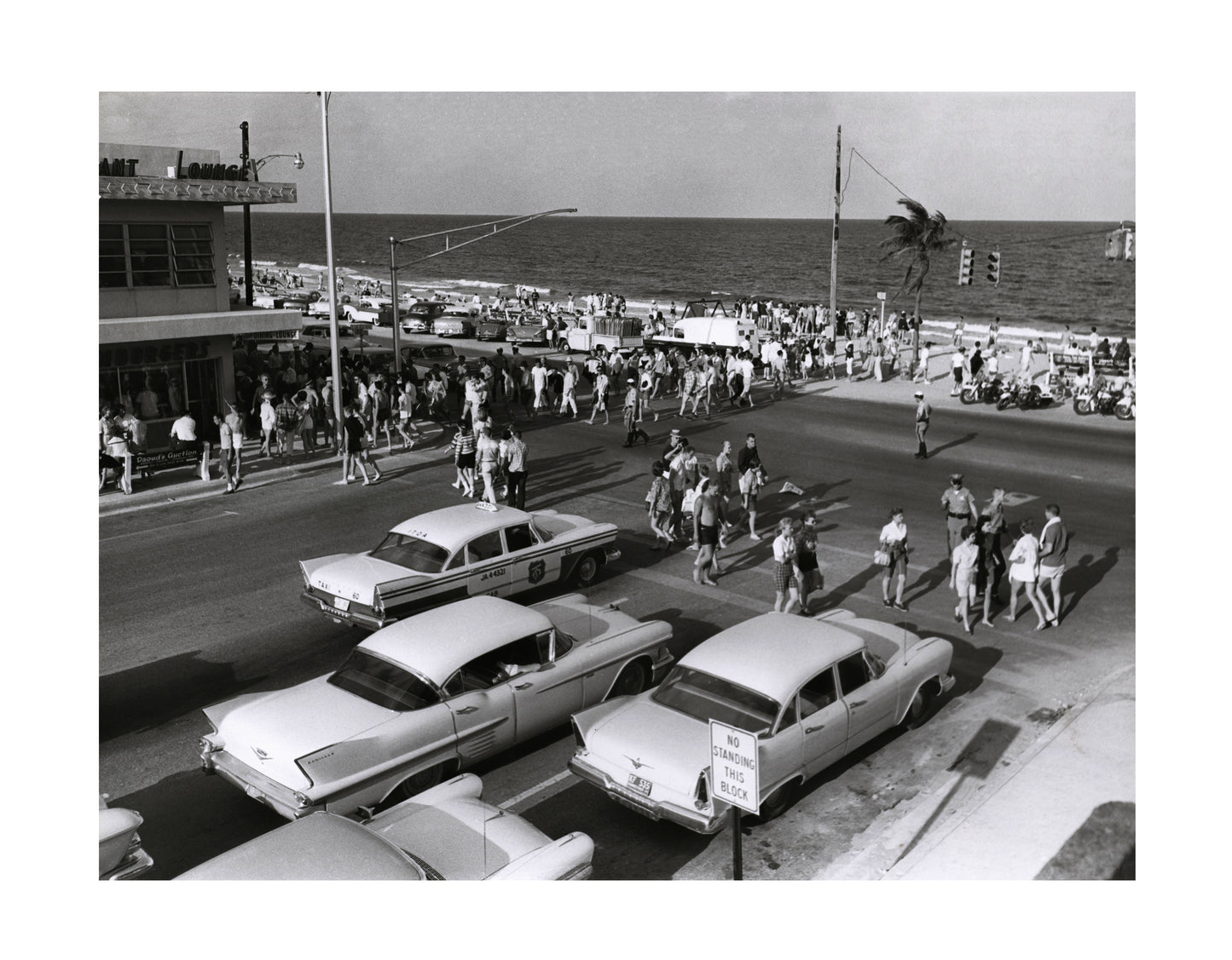 Une image unique représentant une scène de rue animée le long d'une plage. Les superbes automobiles d'époque et la mode dans les rues datent également la photo de la fin des années 50 au début des années 60. Une superbe photo représentant l'Amérique du milieu du siècle.