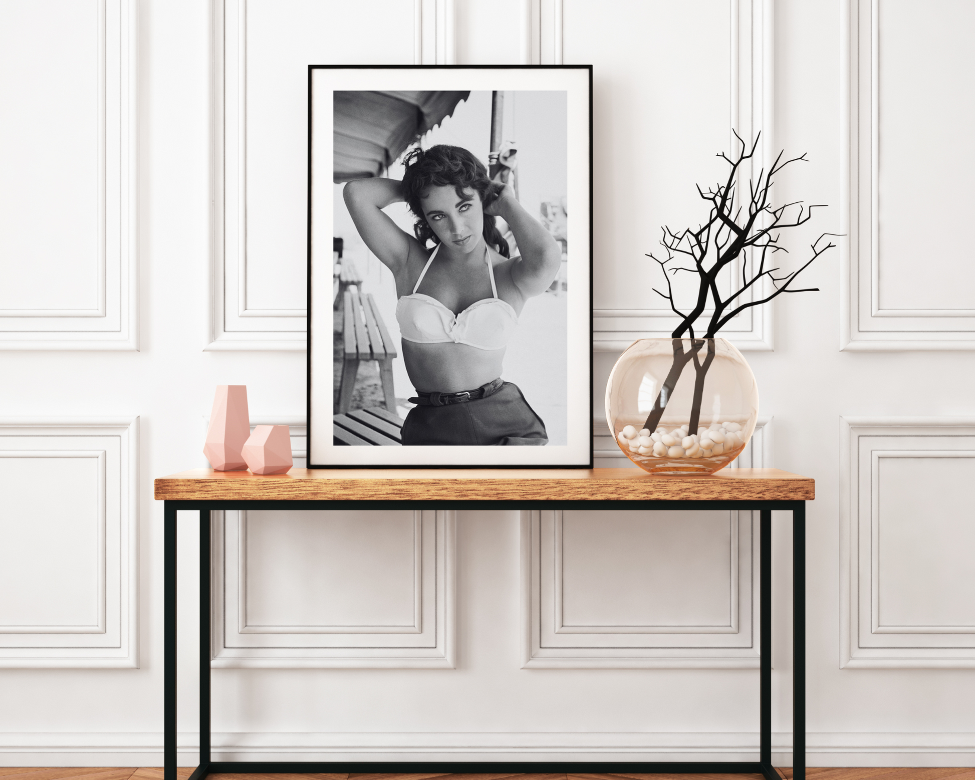 Ce portrait emblématique et élégant, capturé par le célèbre photographe Frank Worth, met en scène l'actrice Elizabeth Taylor sur le tournage du film "Giant" pour son rôle de Leslie Benedict. Ce cliché en noir et blanc à mi-corps montre l'actrice en haut de bikini blanc, posant avec les mains derrière la tête.
