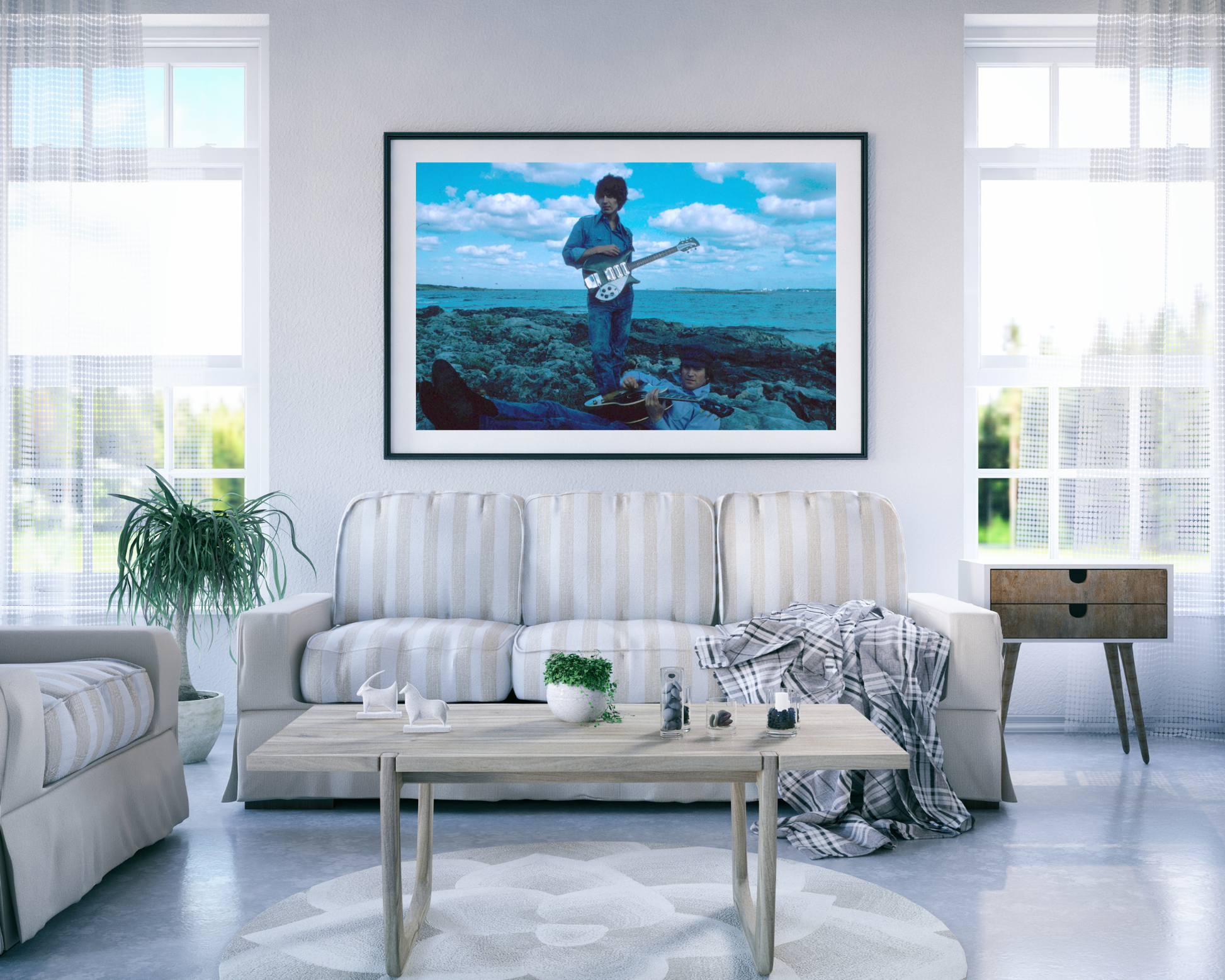 This color photo features John Lennon and George Harrison at a Beach.