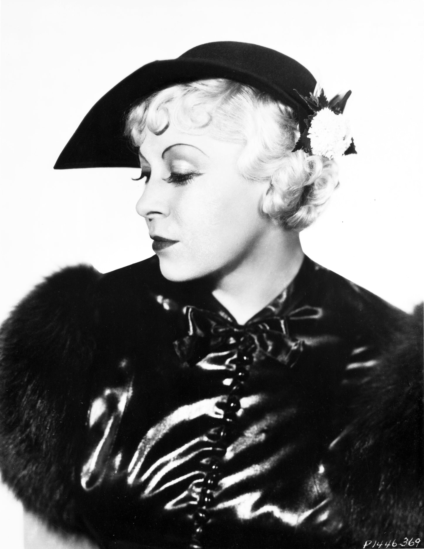 Superbe capture en noir et blanc de l'élégante Mae West, posée de profil.