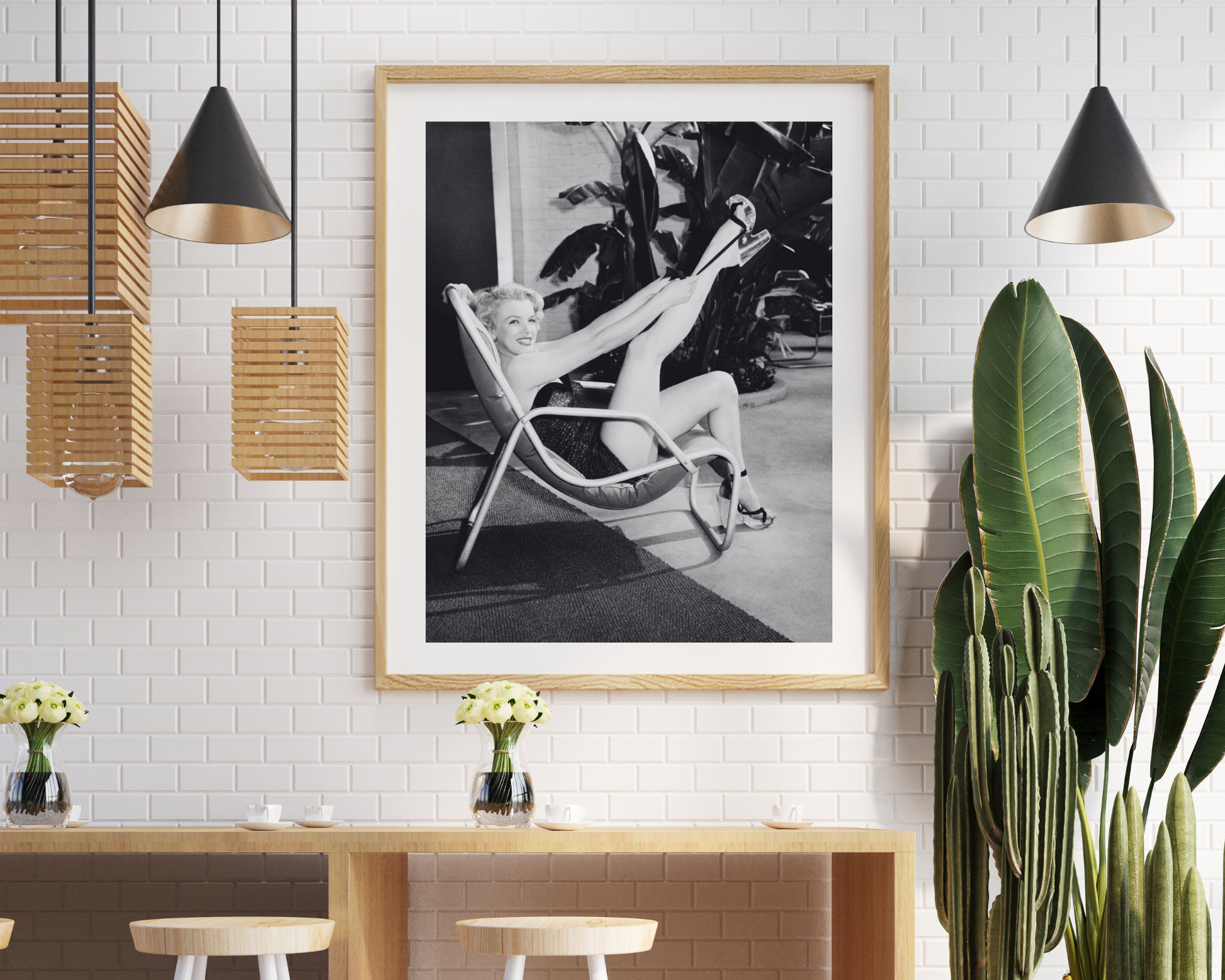 Ce portrait de style pin-up en noir et blanc met en scène l'actrice blonde et icône du cinéma Marilyn Monroe. Prise par le photographe de célébrités Frank Worth, cette image sexy met en scène l'actrice assise sur une chaise au bord de la piscine, en talons et en maillot de bain tenant sa jambe en l'air.