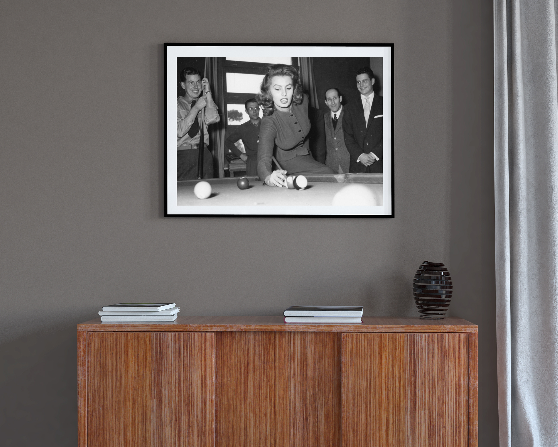 Une photographie vintage de 1958 mettant en vedette l'actrice italienne Sophia Loren montrant ses compétences au billard telles que capturées par l'agence photo italienne Liverani de Rome lors d'une séance photo privée, vers 1958.
