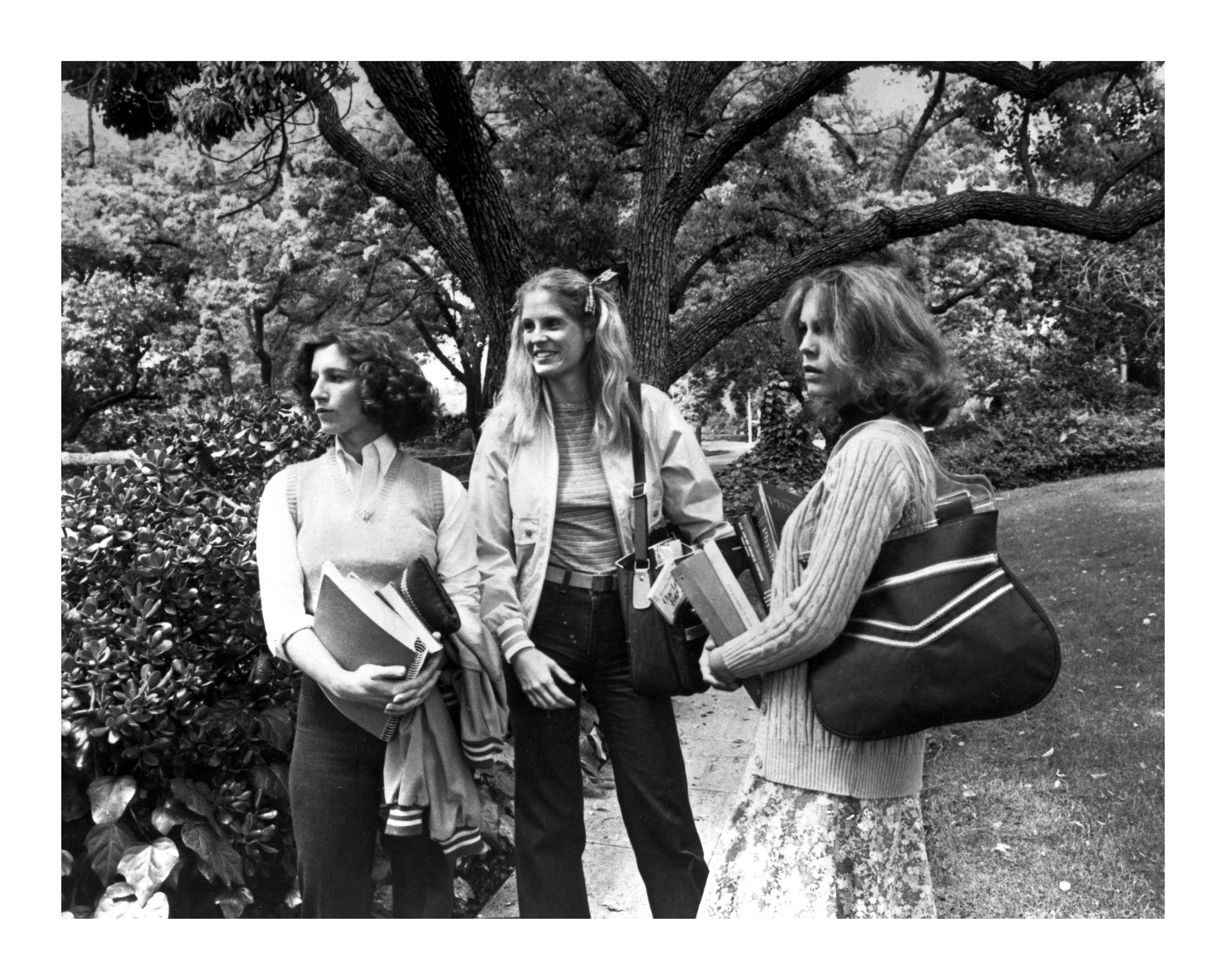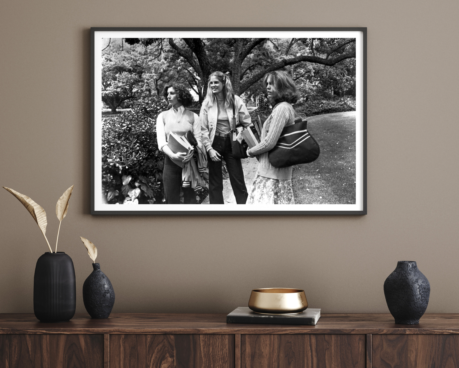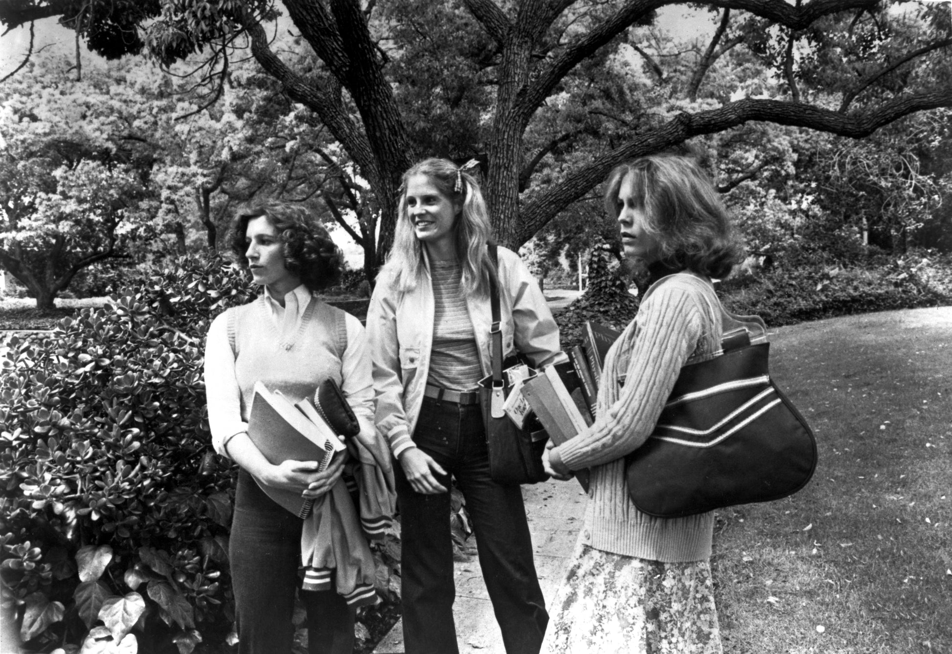 Black-and-white still from Halloween (1978), featuring Jamie Lee Curtis and co-stars walking together through a suburban neighborhood. The casual setting contrasts with the film’s mounting tension, capturing an early moment before the terror unfolds.