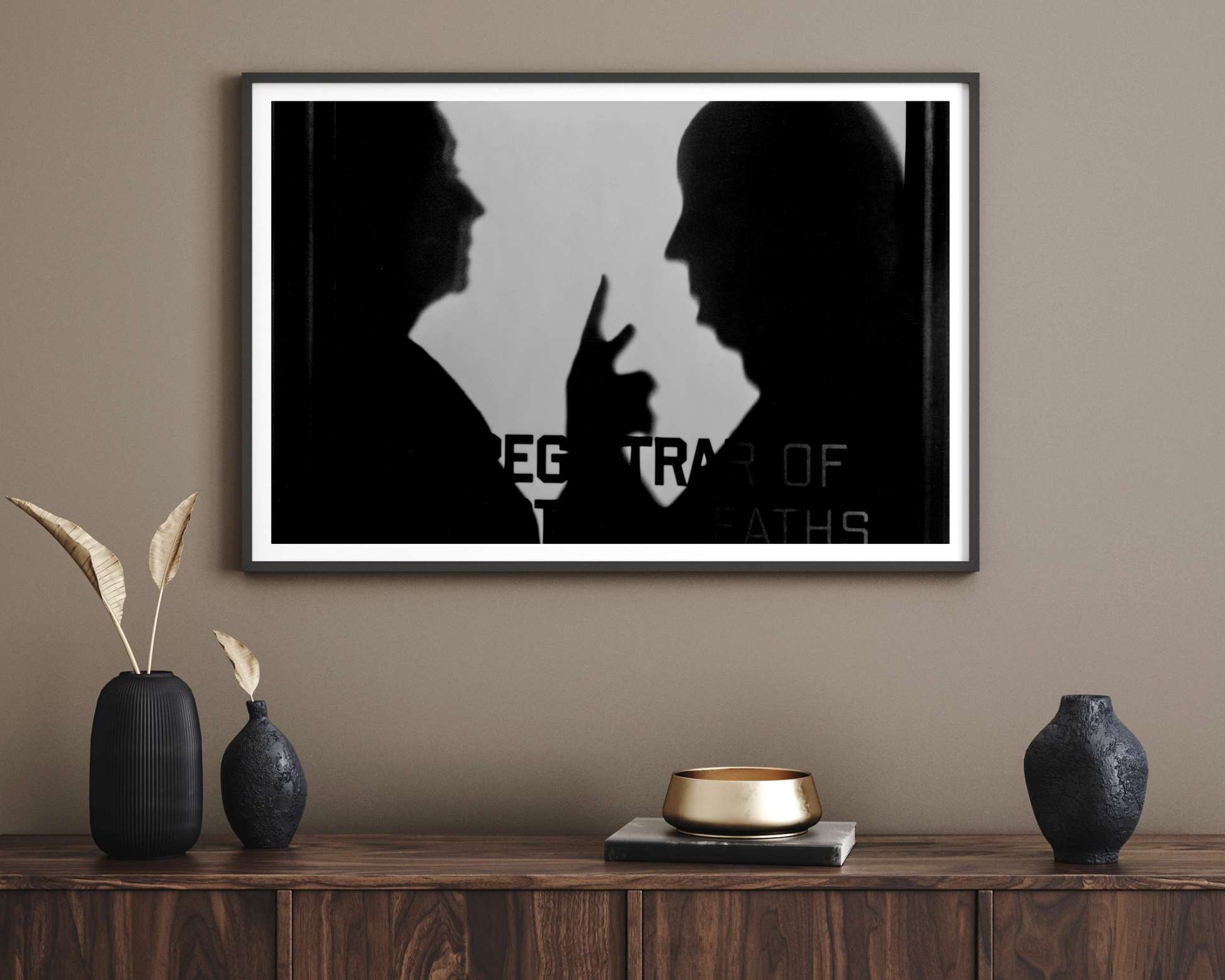 Black-and-white silhouette image of famed director Alfred Hitchcock behind a frosted glass door marked “Registrar of Deaths.” His distinct profile and dramatic gesture capture the master of suspense’s darkly playful personality and signature visual style.