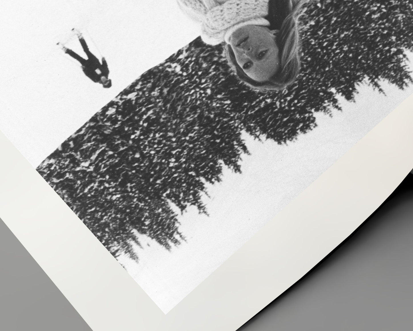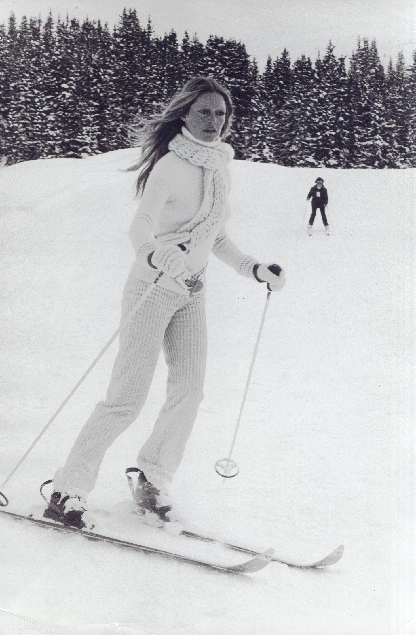 Black and white action shot of star actress Brigitte Bardot skiing in Switzerland, circa 1971.