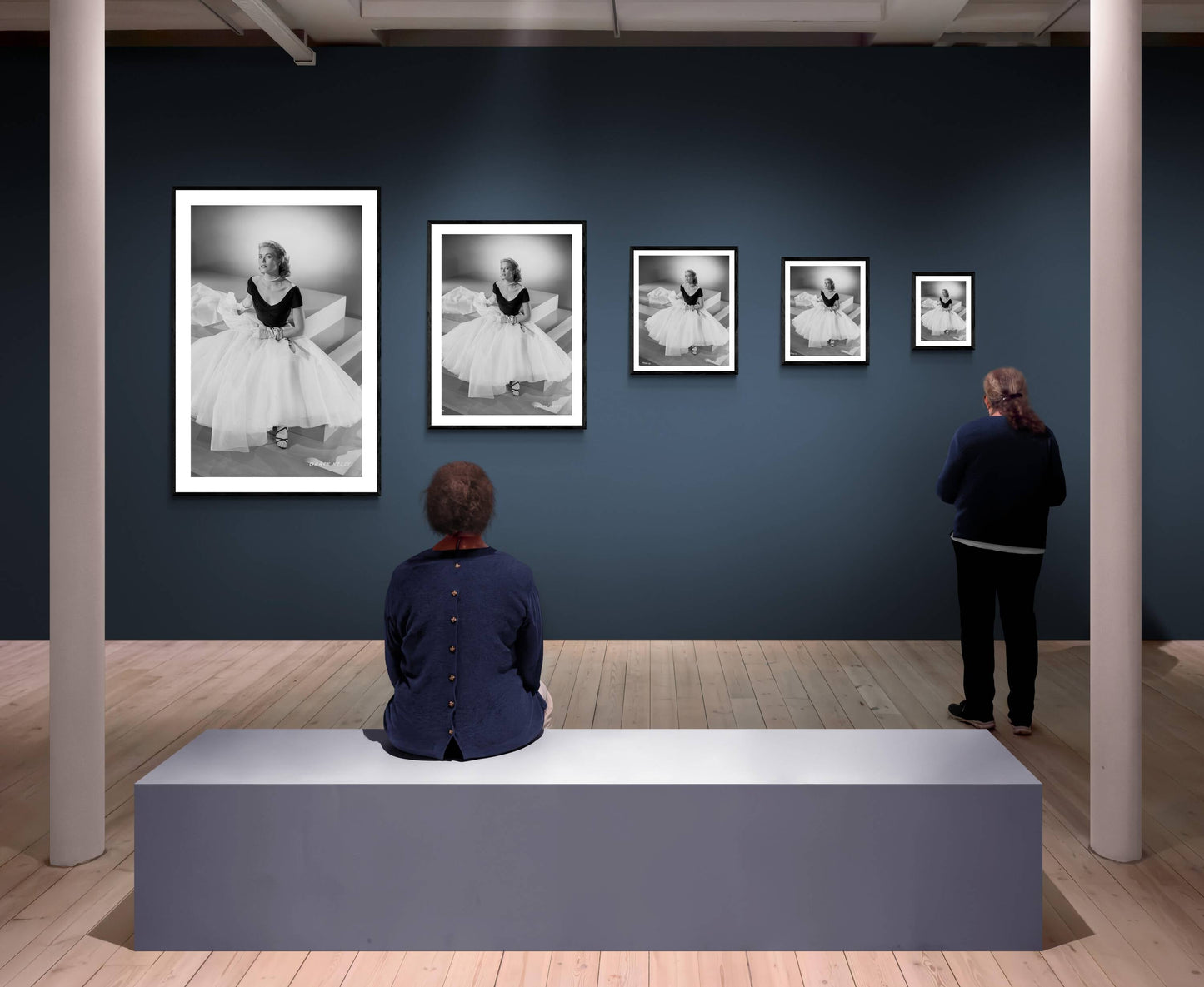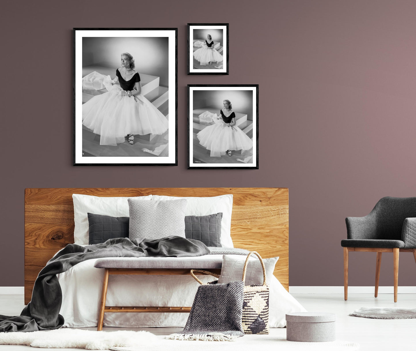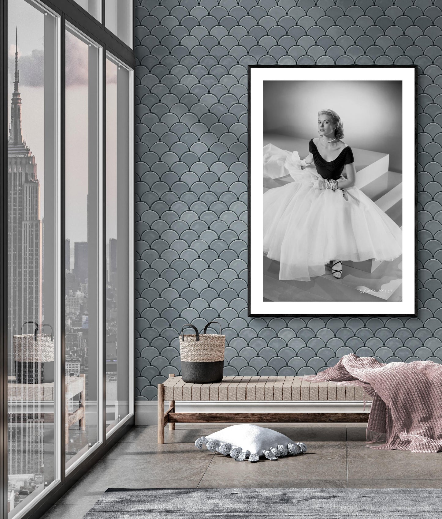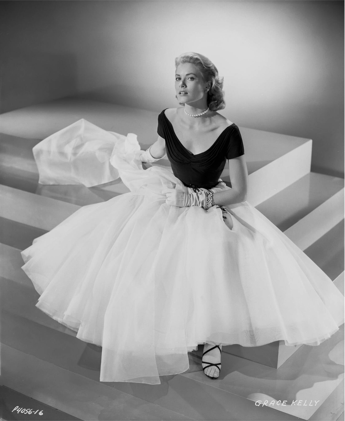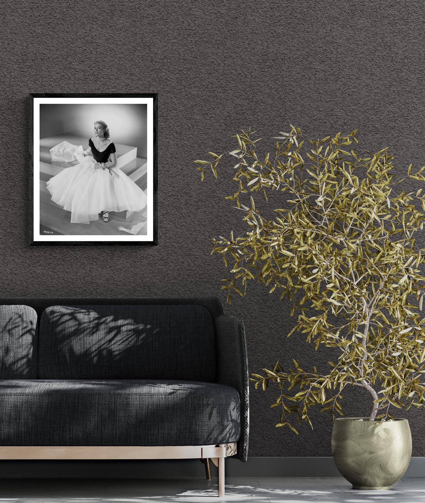 This elegant full-length studio portrait features the 'Princess of Grace', Grace Kelly. This image captures the star in a tulle skirt, sitting on steps inside of a photo studio.