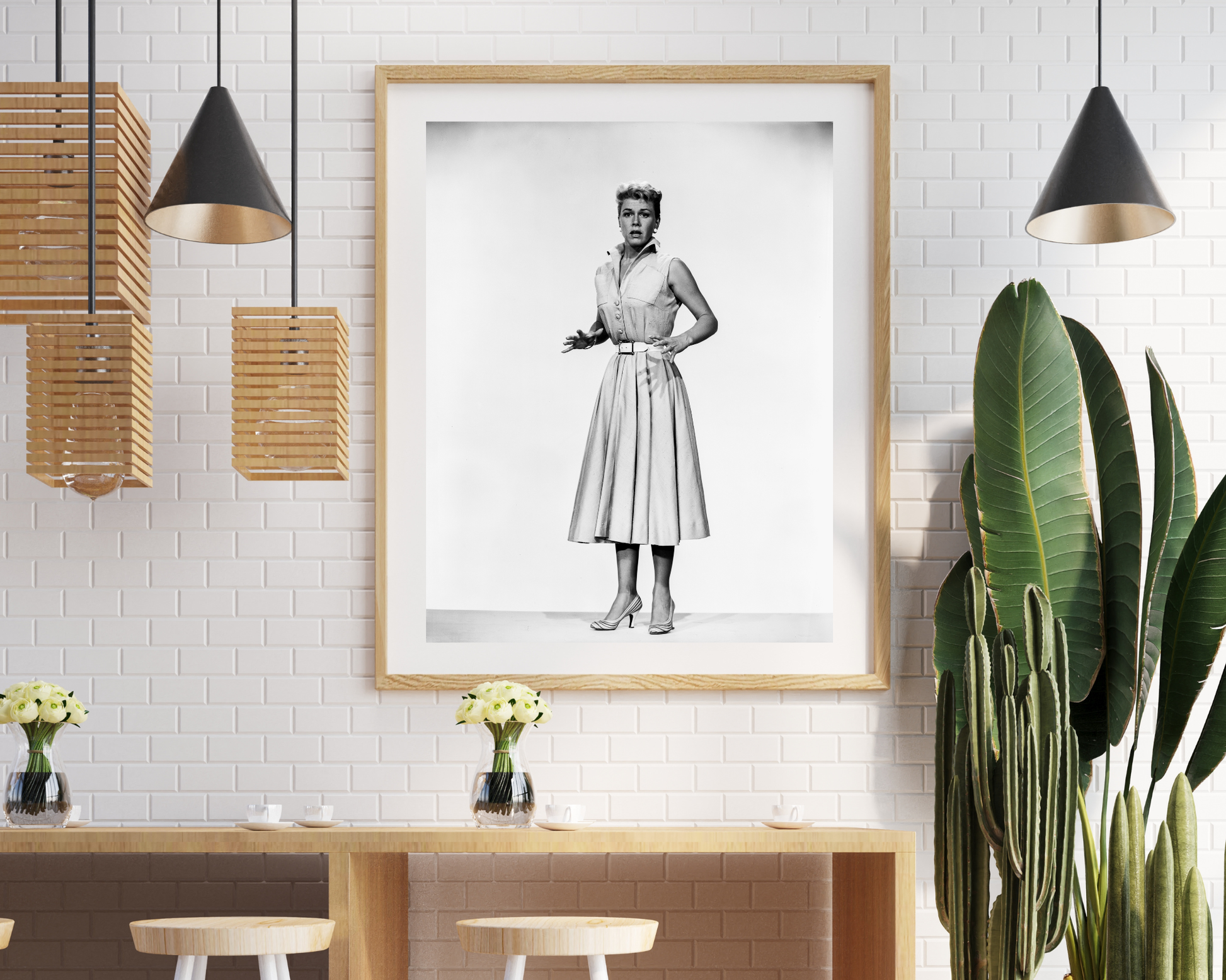 Black-and-white studio still of Doris Day from Alfred Hitchcock’s The Man Who Knew Too Much (1956). She starred opposite James Stewart in this suspense thriller about an American couple caught in an international assassination plot while vacationing in Morocco.