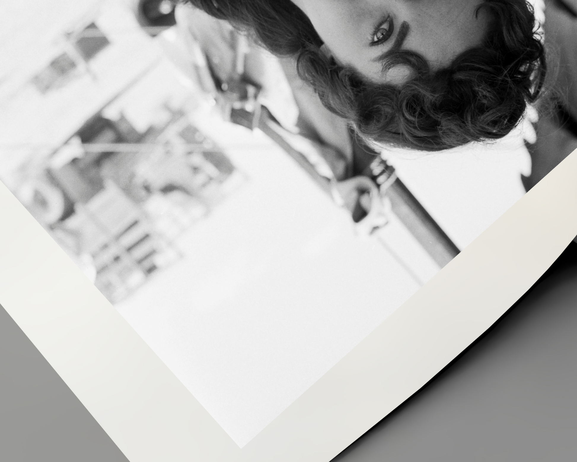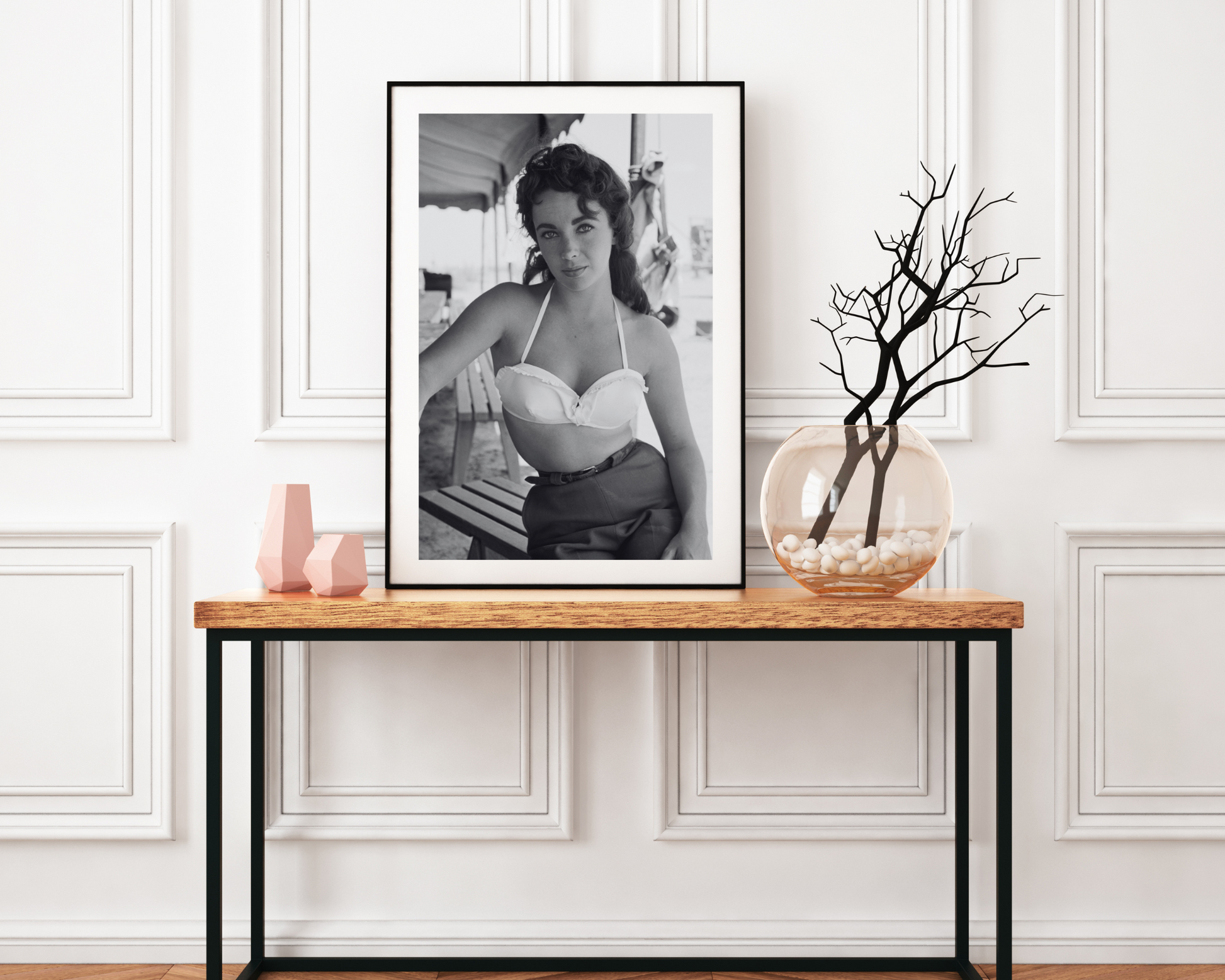 This iconic and elegant portrait captured by celebrity photographer Frank Worth features actress Elizabeth Taylor on the set of the film "Giant" for her role as character Leslie Benedict. This black and white half-length shot features the actress in a white bikini top behind the scenes.