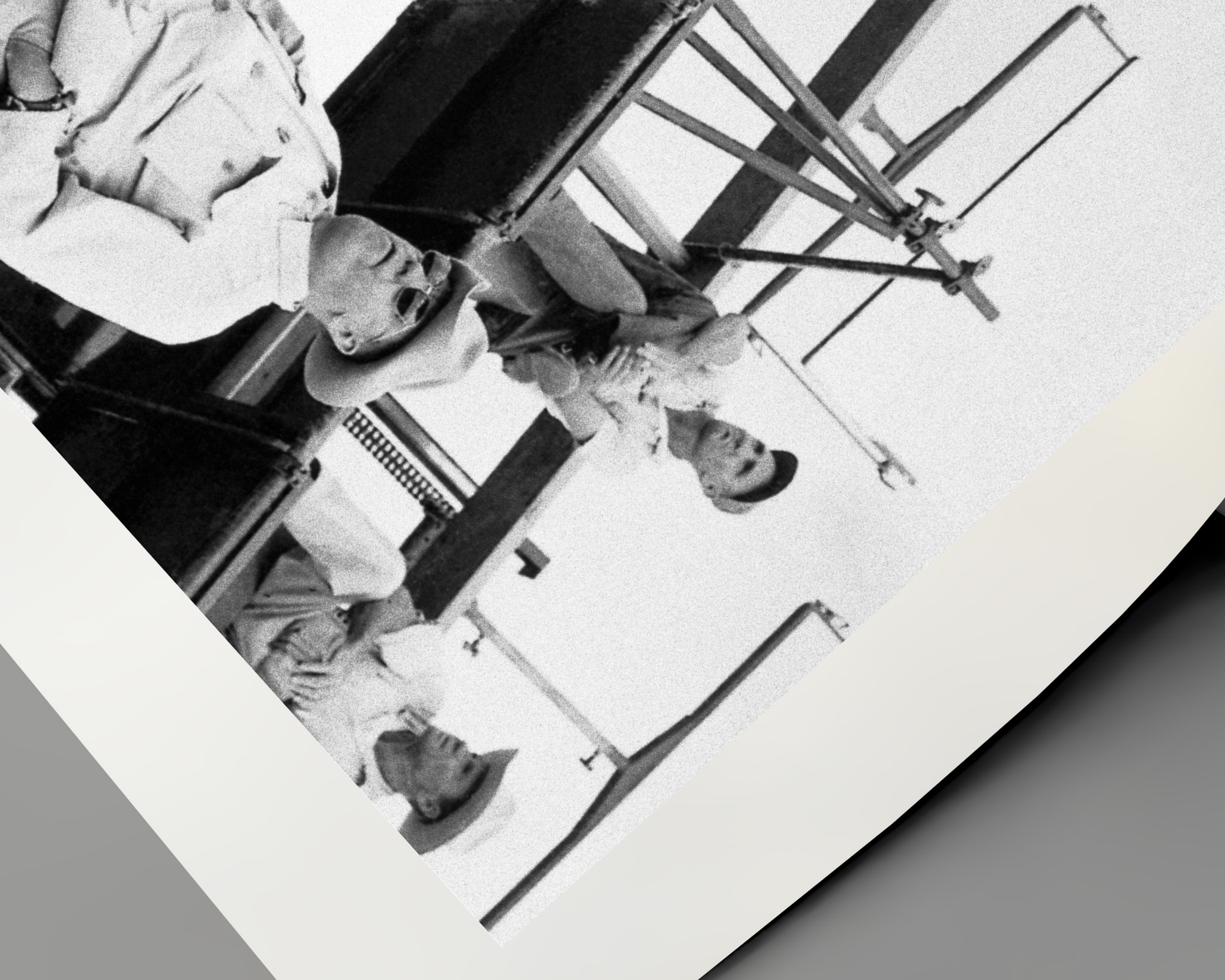 This black and white photograph features Elizabeth Taylor, Rock Hudson, and George Stevens on the set of Giant.
