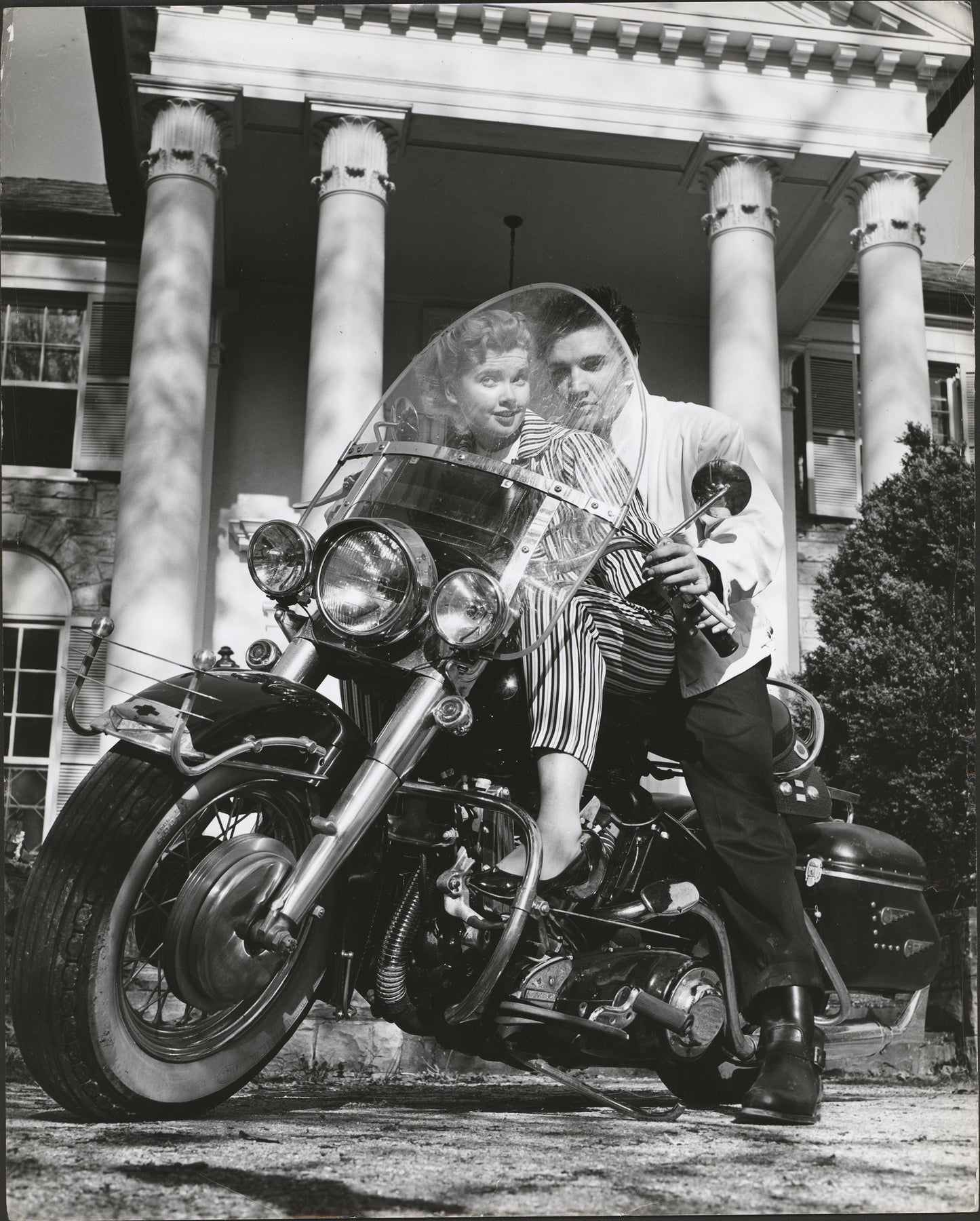A Vintage 1957 image depicting music's new sensation Elvis Presley on his brand new Harley Davidson FLH in front of his new mansion home, Graceland. With his is his girlfriend actress, Yvonne Lime. This early photo was captured on April 19, 1957 by Commercial Appeal photographer Bob Williams and syndicated by The Galloon Photo Agency of New York when the young monarch of Rock n' Roll was building his kingdom.