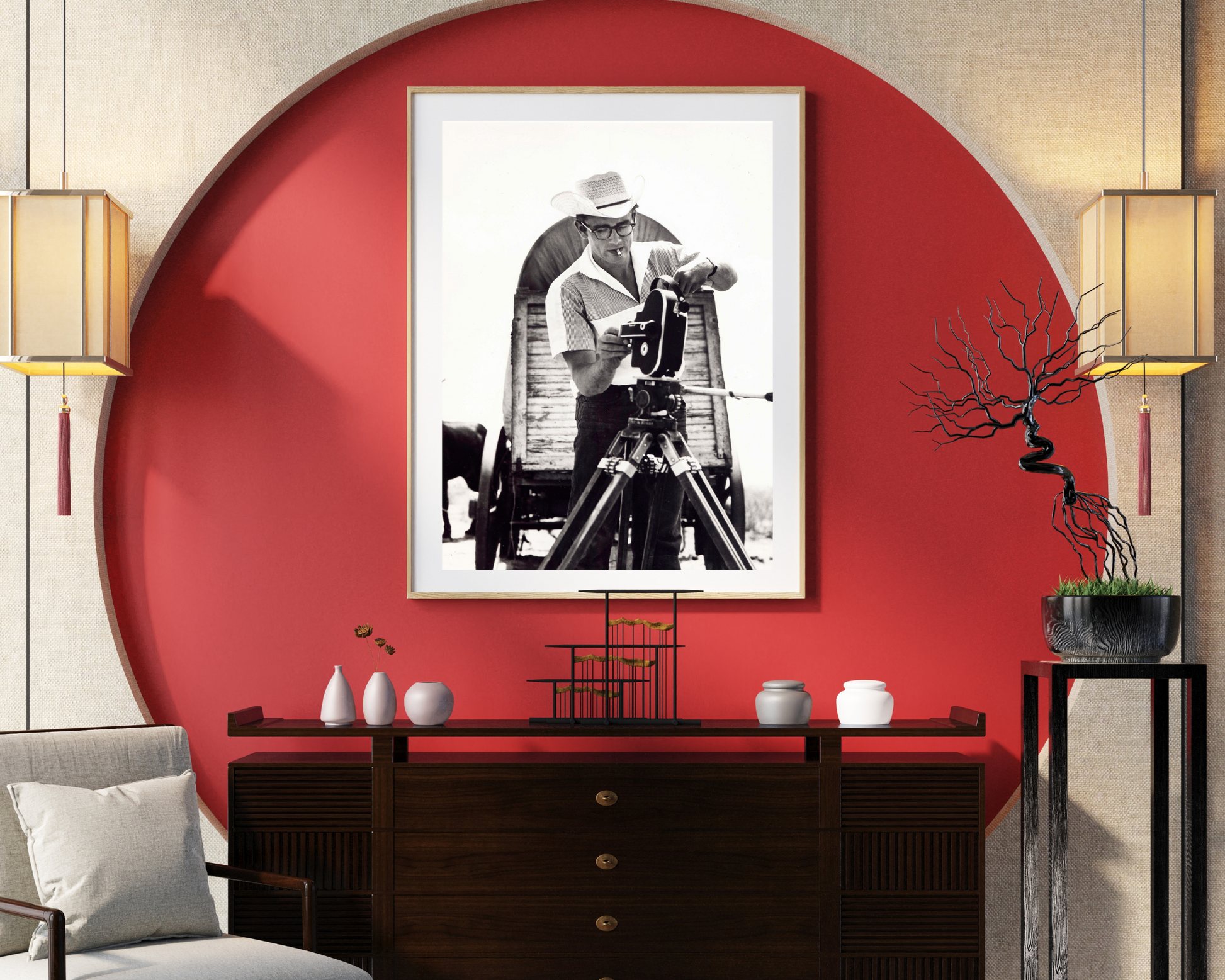 This candid black and white image features actor James Dean behind the scenes while filming, working with a film camera and wearing a cowboy hat.