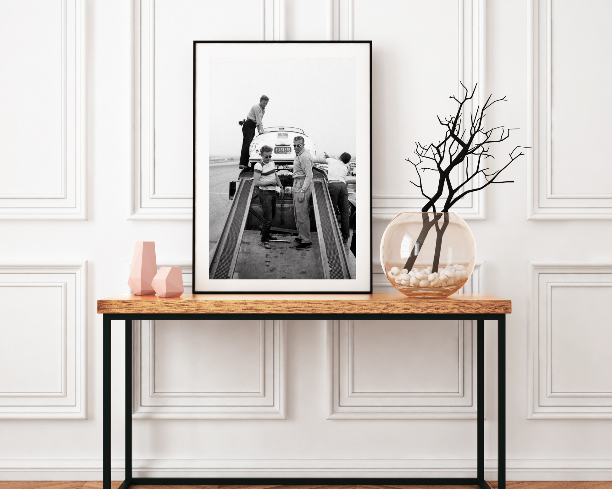 Black and white action shot of actor James Dean unloading his Porsche at a car rally.