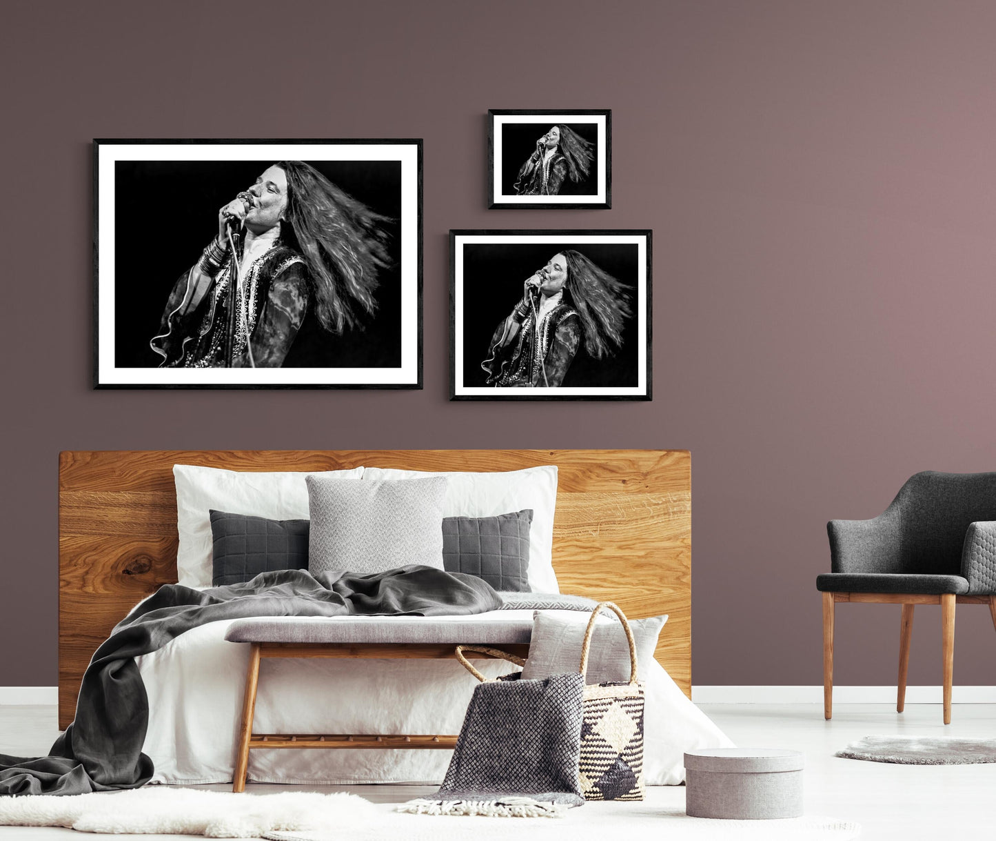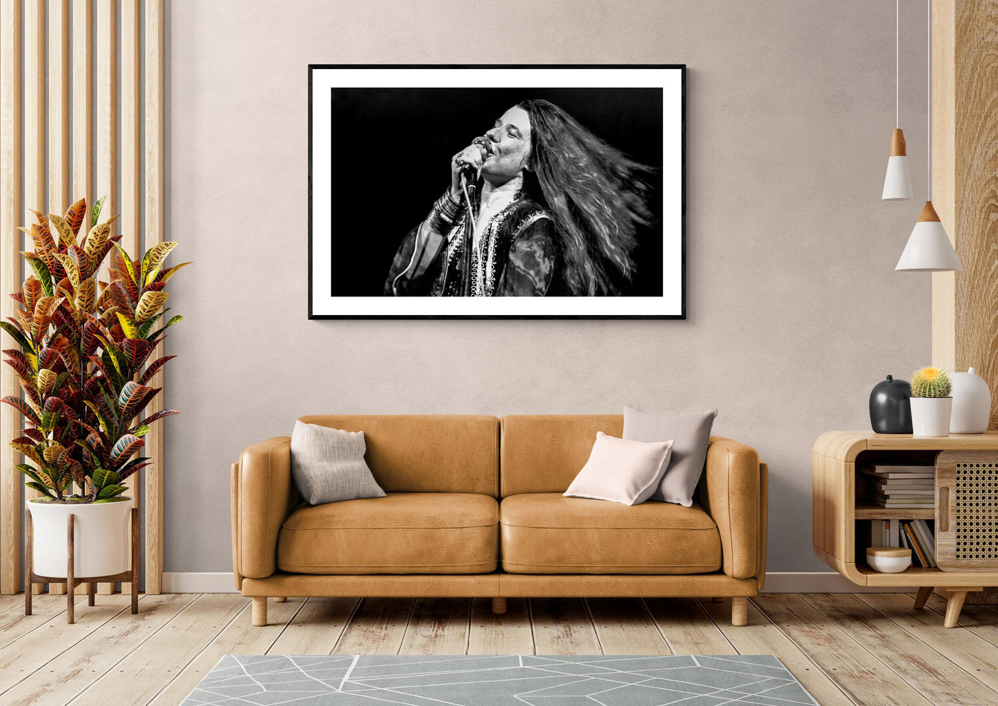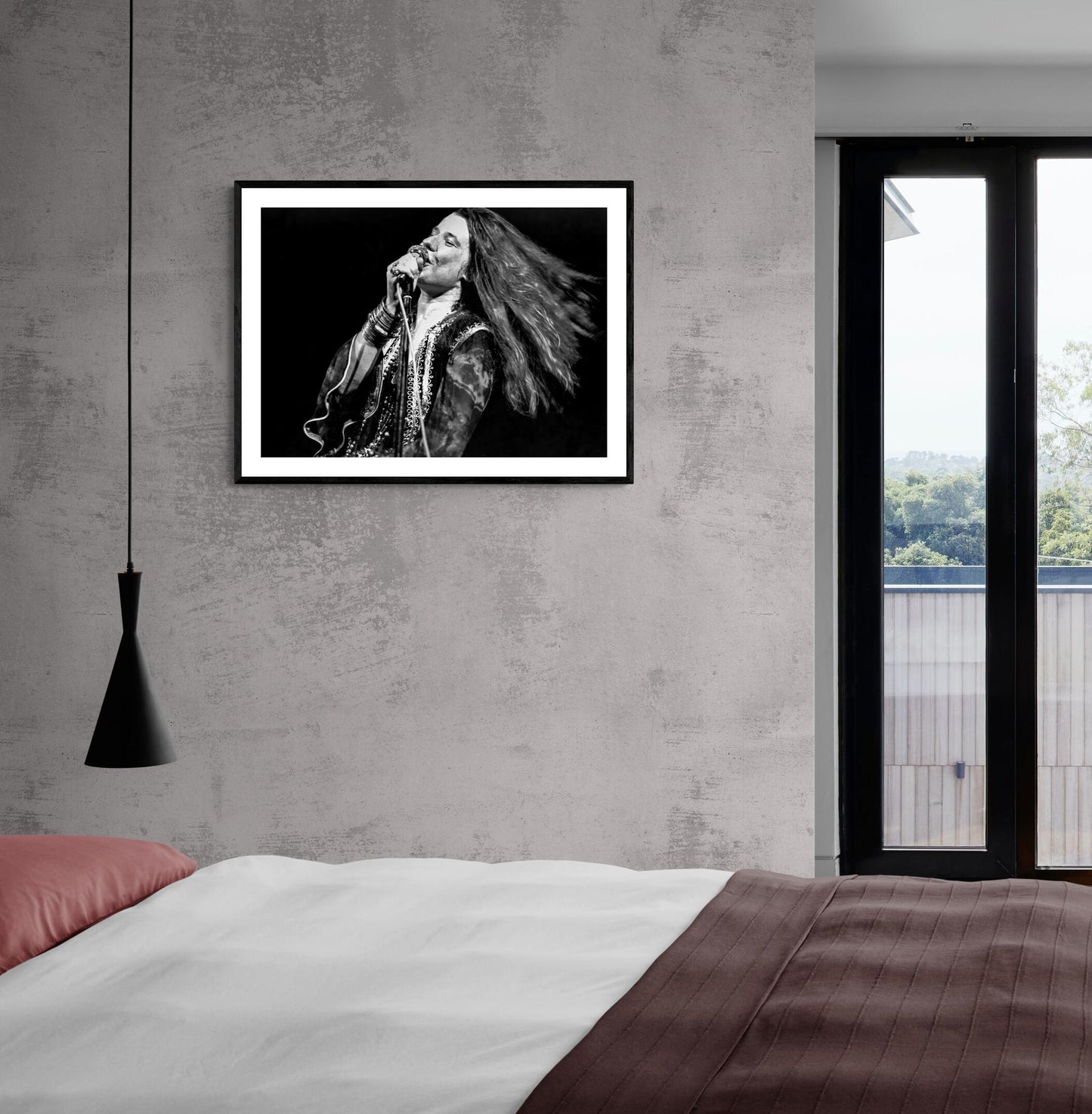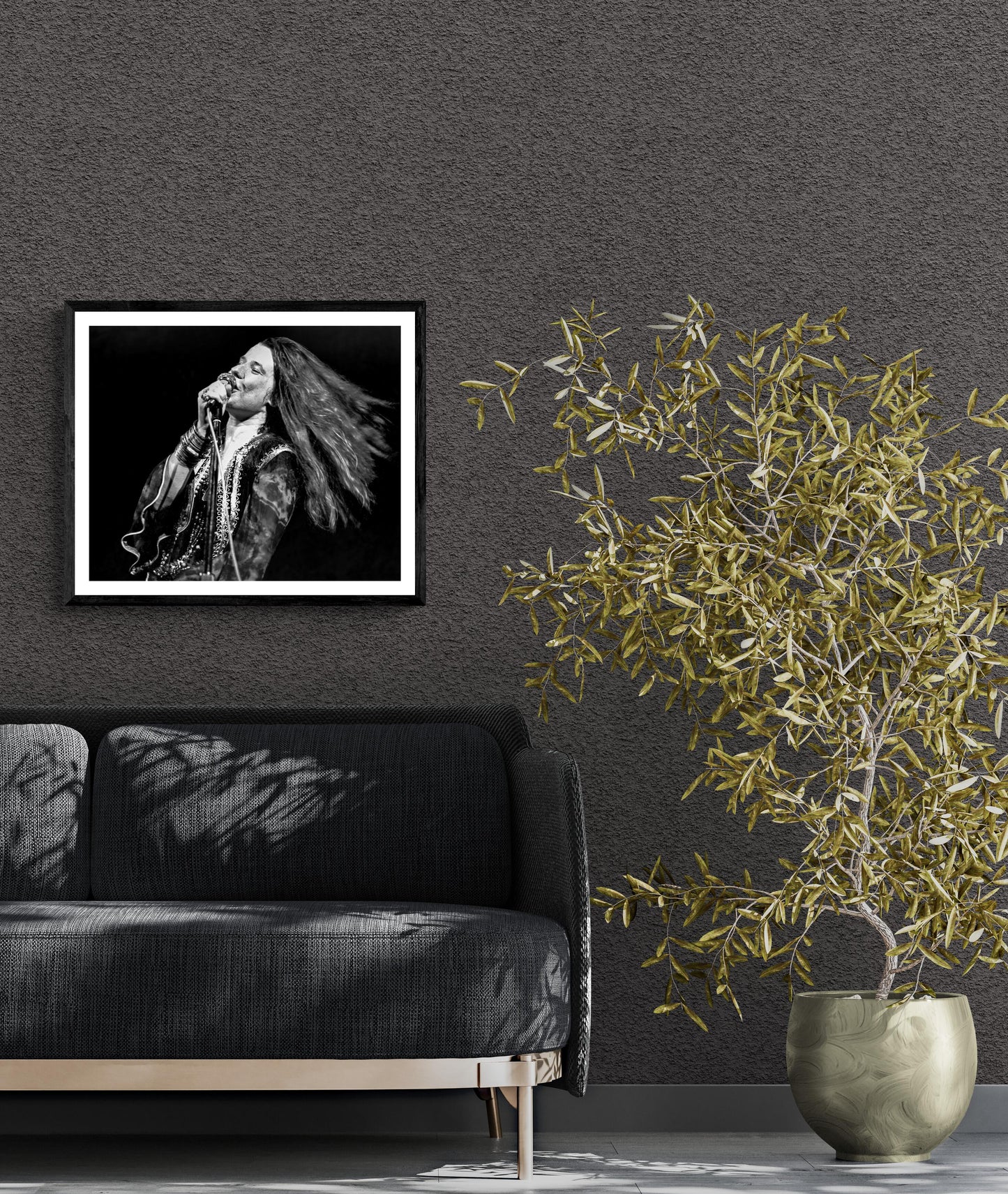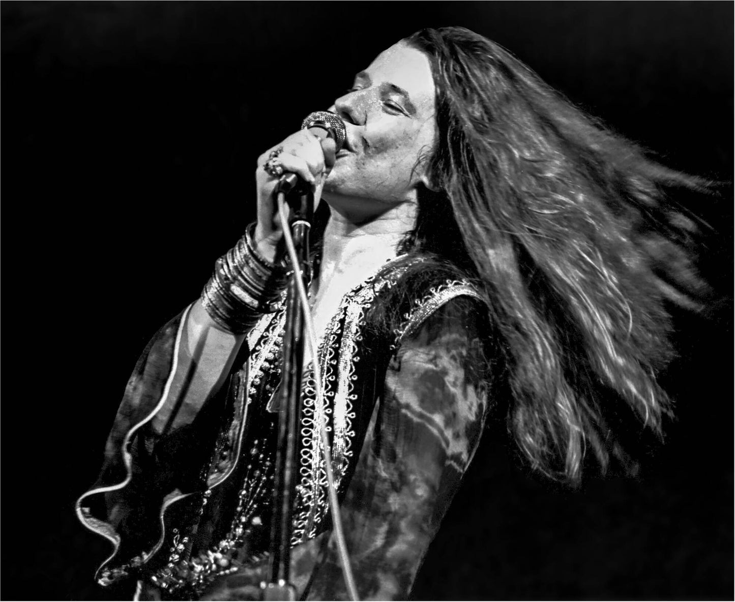 Black and white portrait of Janis Joplin singing into the microphone at Woodstock.