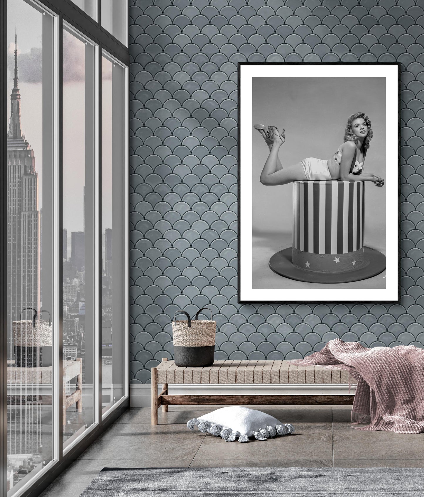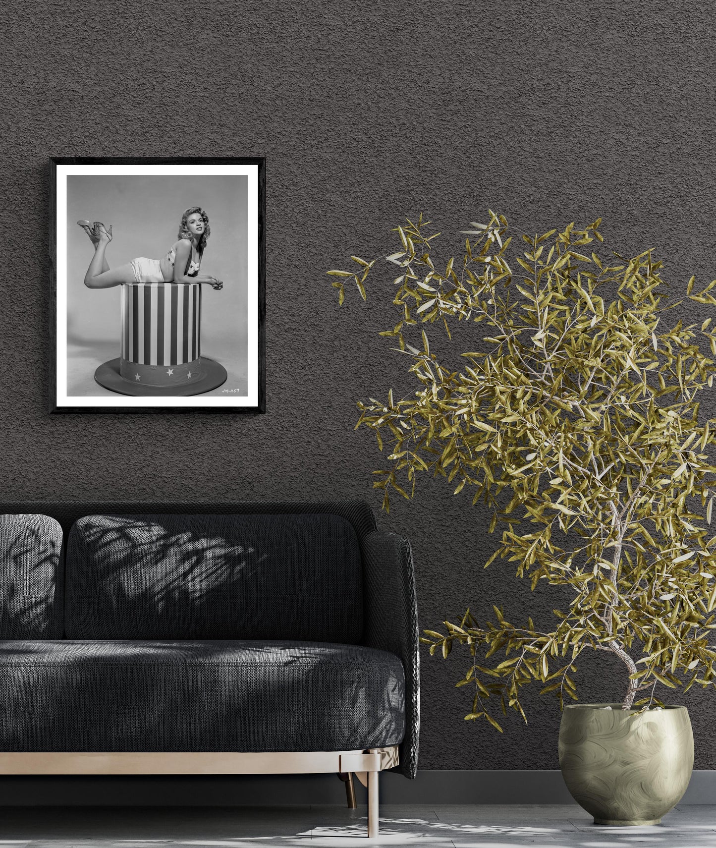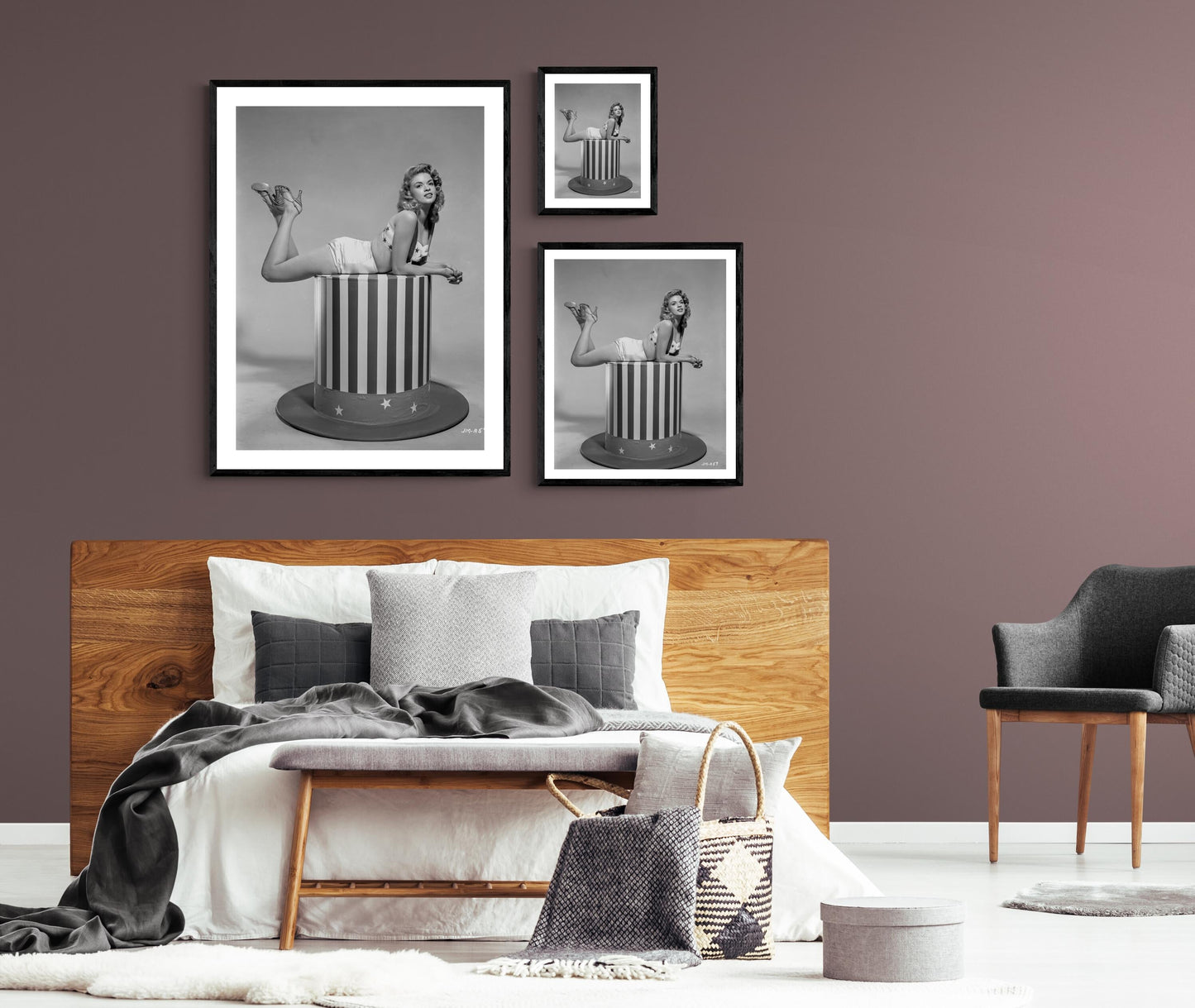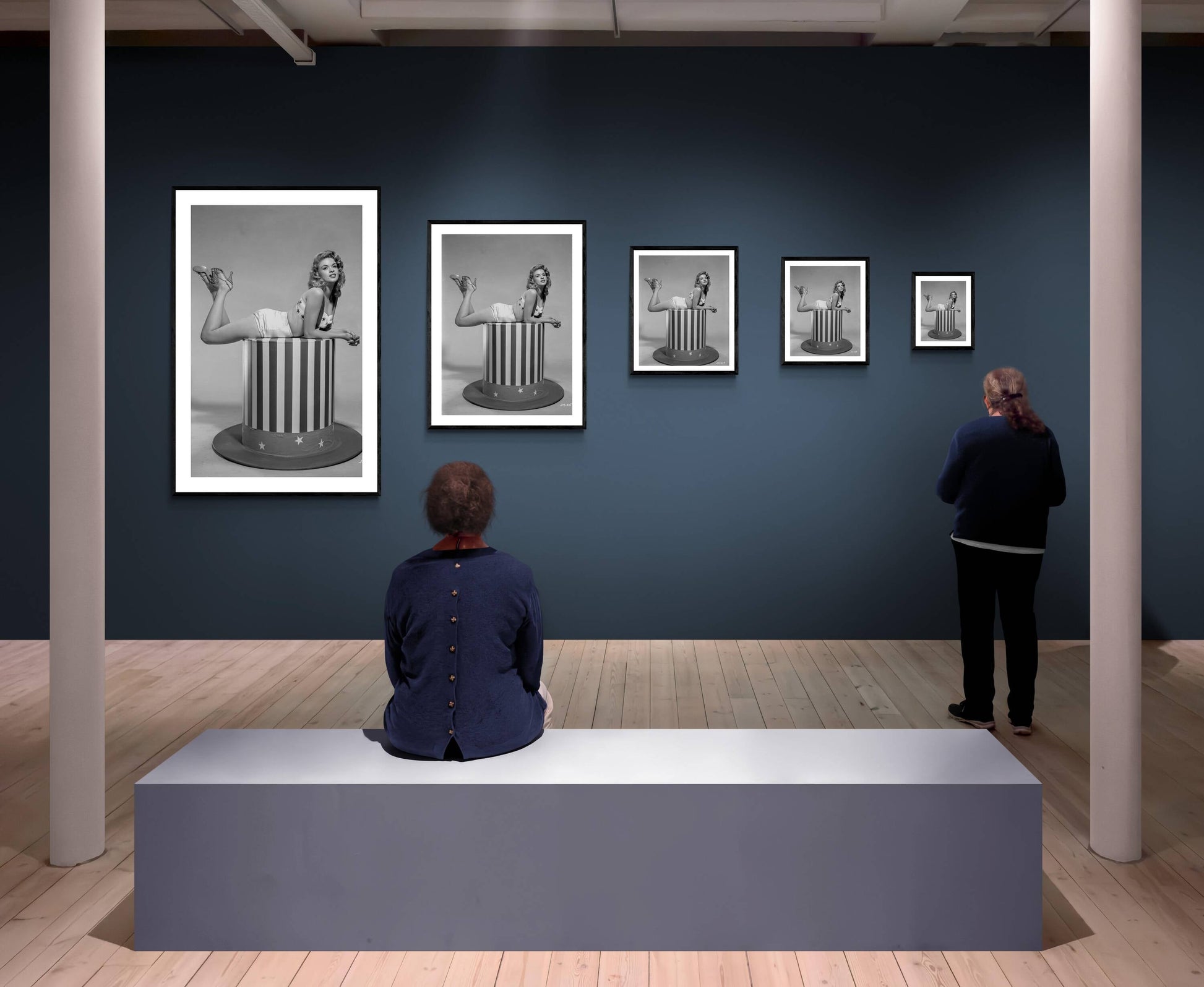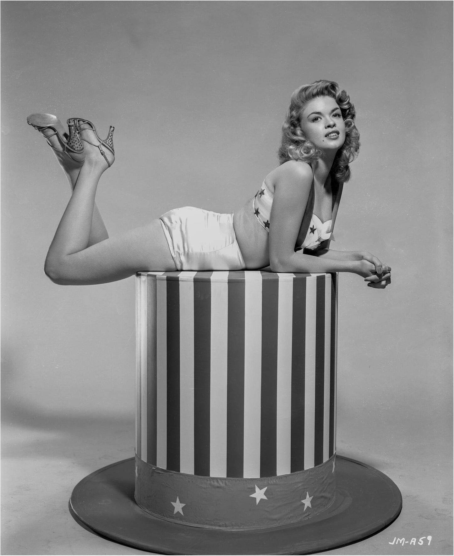 This vintage portrait features a pinup of Jayne Mansfield posed in a patriotic scene, lying on a flag motif tophat.