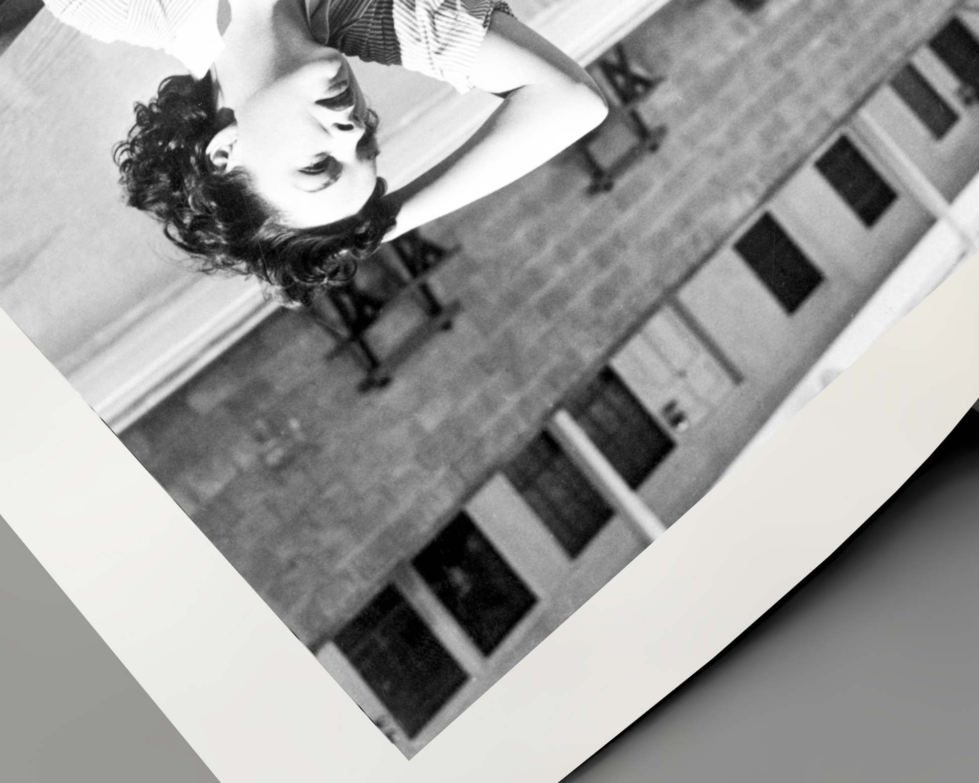 This black and white capture features Judy Garland sitting on poolside mattress with her legs crossed.