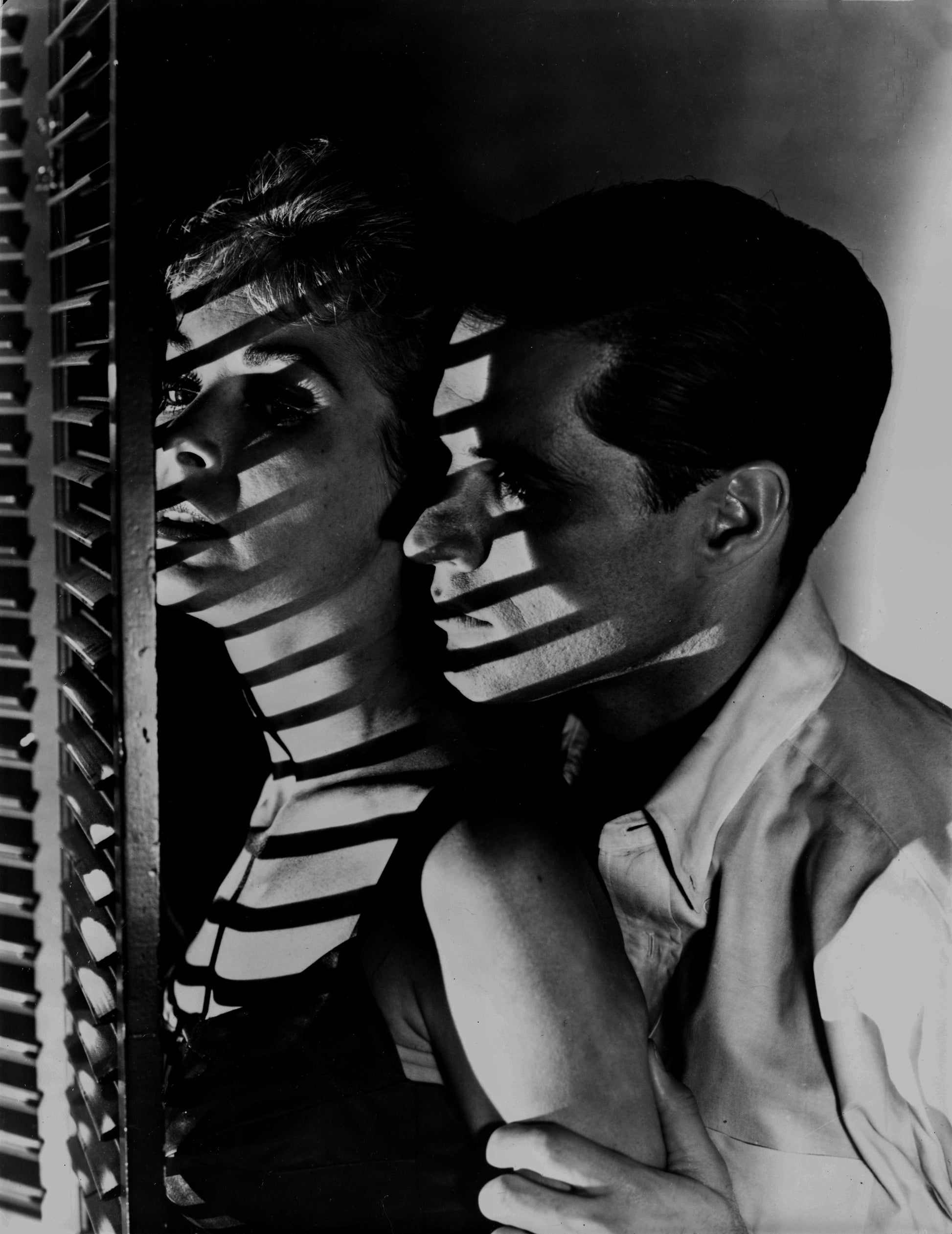 Black-and-white still from Alfred Hitchcock’s Psycho (1960), featuring Janet Leigh and John Gavin in an intimate and shadow-filled moment that sets the tone for the film’s tension and psychological unease.