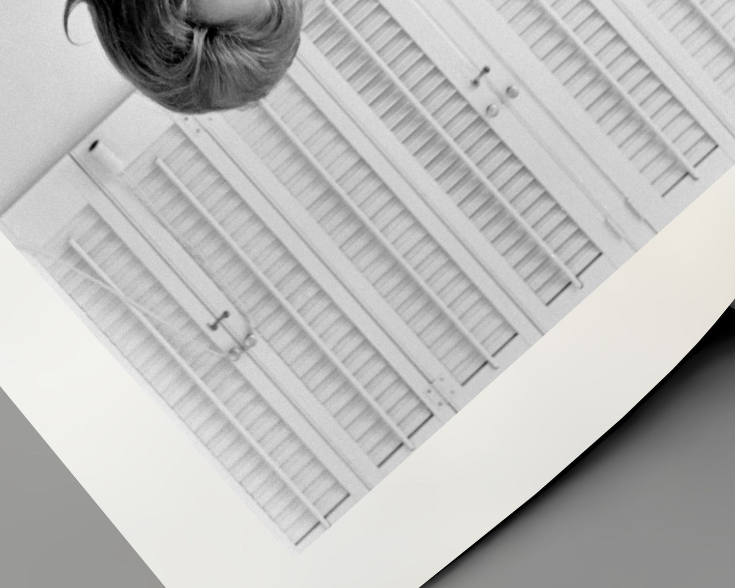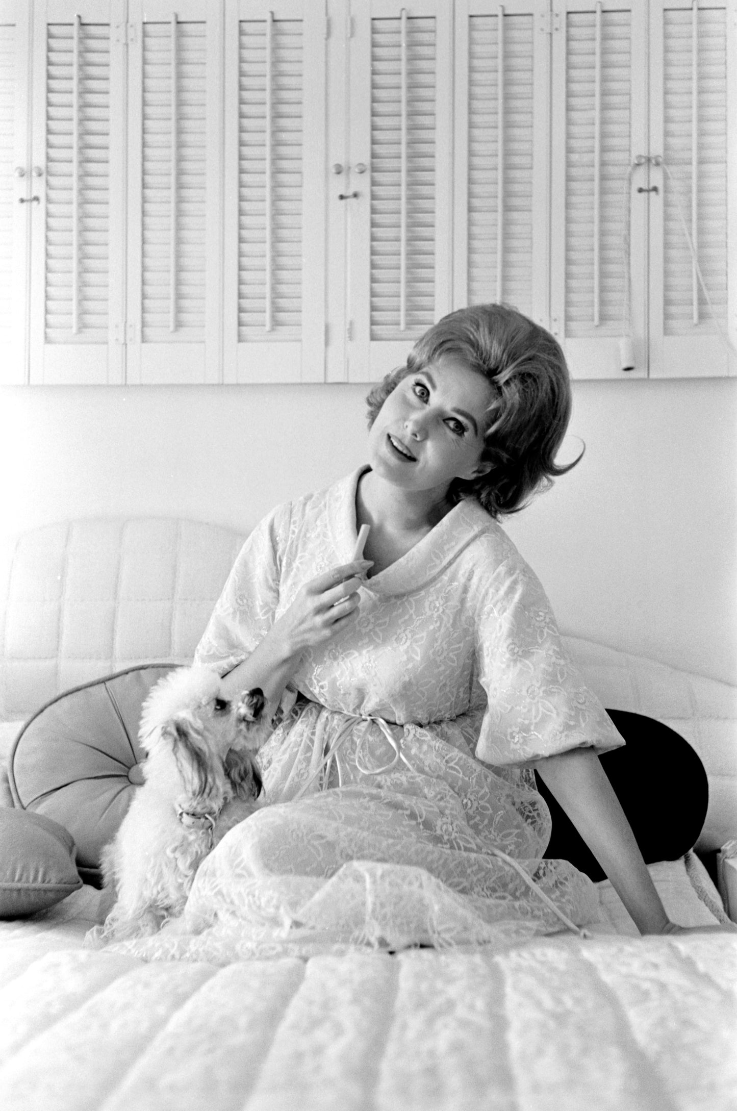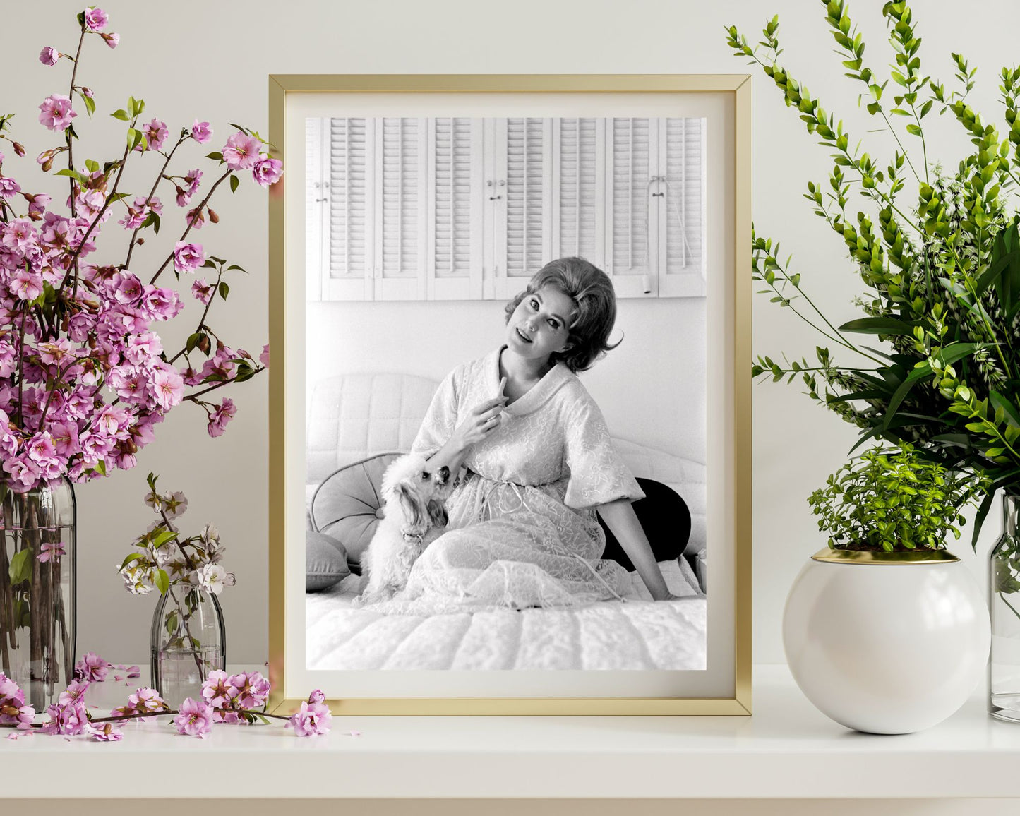 This black and white capture features portrait of Rhonda Fleming sitting beside dog on bed at home.Rhonda Fleming was an American film and television actress and singer. She acted in more than 40 films, mostly in the 1940s and 1950s, and became renowned as one of the most glamorous actresses of her day, nicknamed the "Queen of Technicolor" because she photographed so well in that medium.