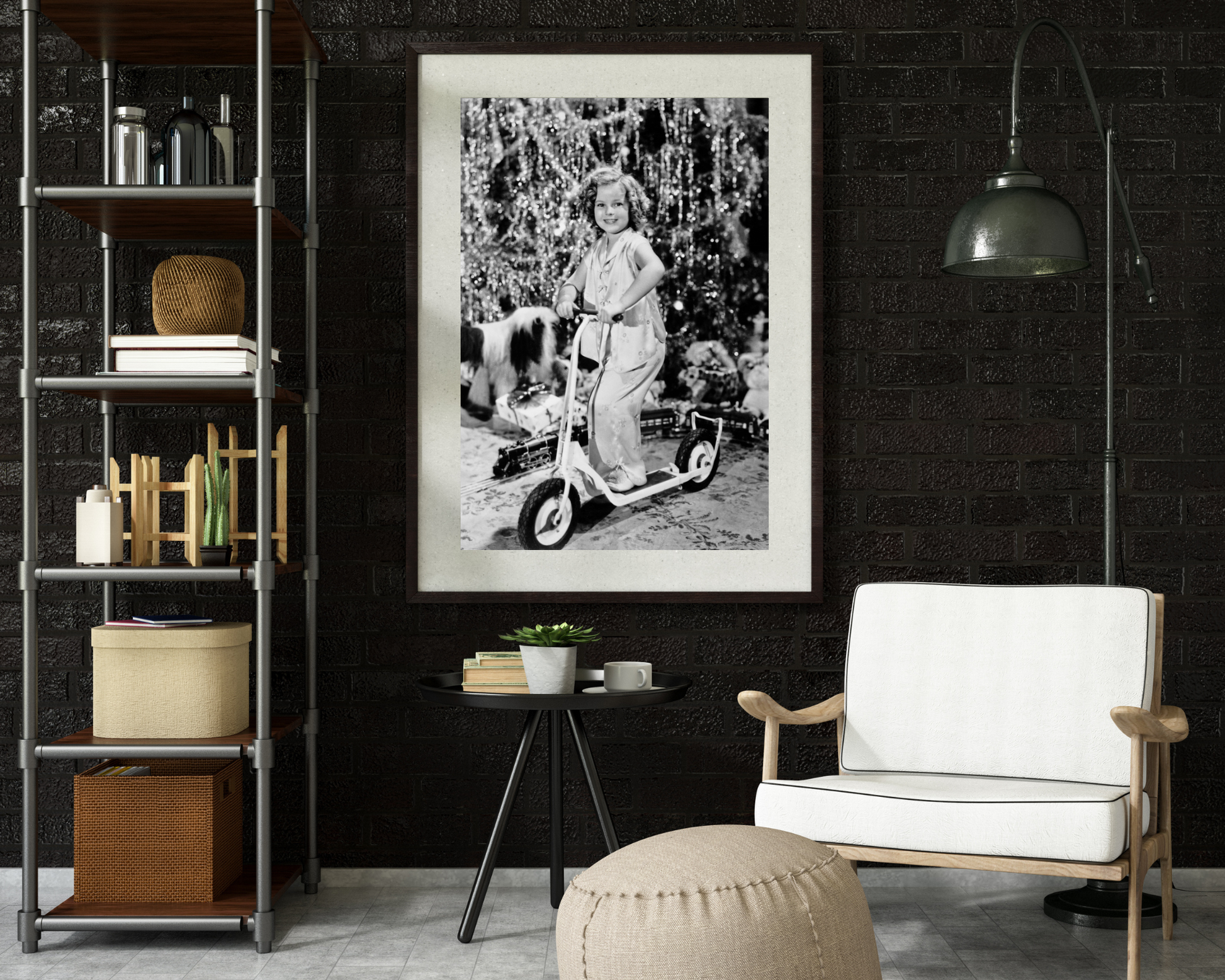 This image shows a joyful holiday scene of Shirley Temple standing on a scooter in front of a richly decorated Christmas tree. Wrapped gifts, a toy train set, and plush animals surround her, creating a warm and playful Christmas morning setting. Her relaxed posture and bright smile capture a sense of excitement and innocence, while the softly glowing ornaments and tinsel in the background add a classic seasonal atmosphere.