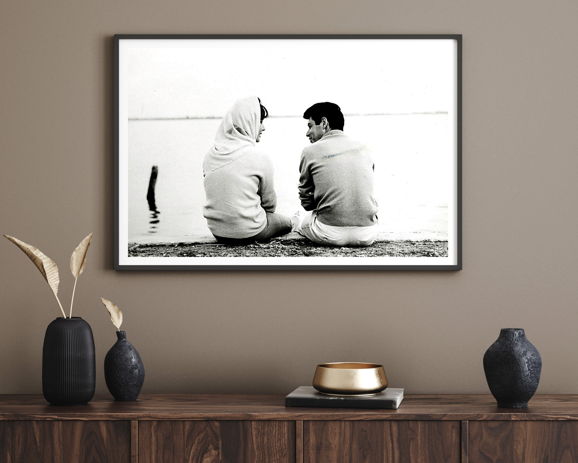 Black and white photo featuring the elegant actress Elizabeth Taylor and husband Eddie Fisher sitting on the ocean shore.