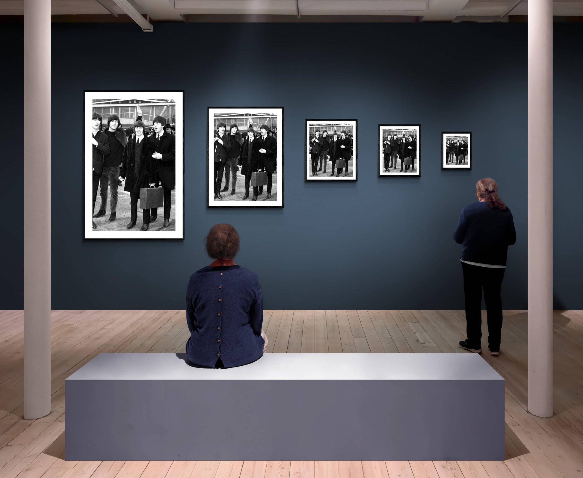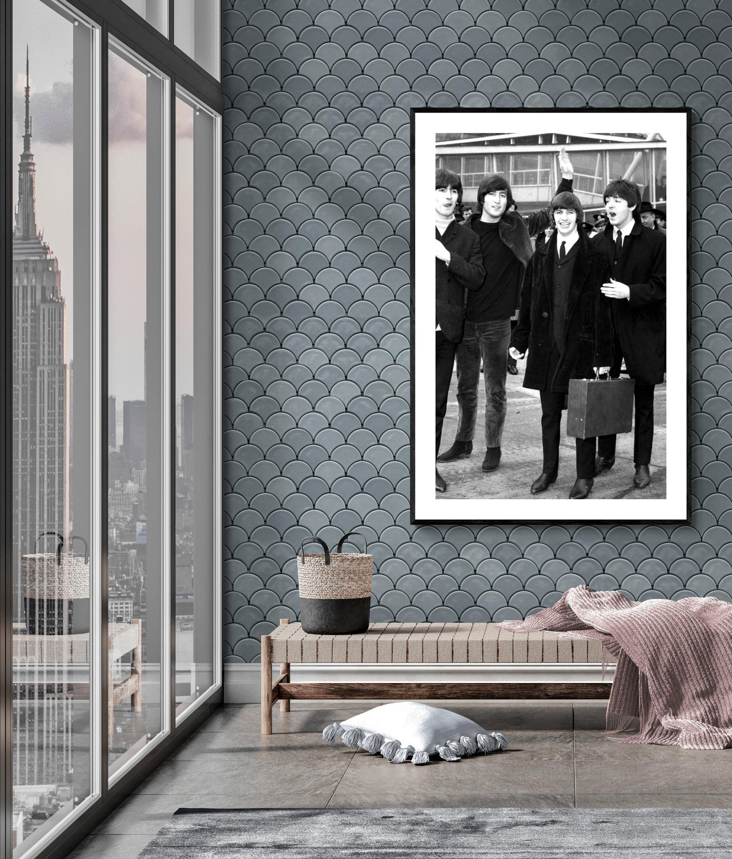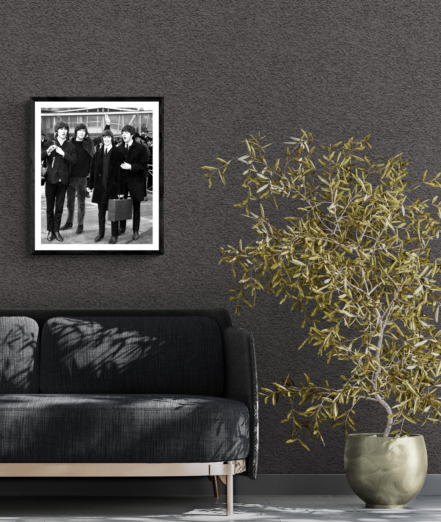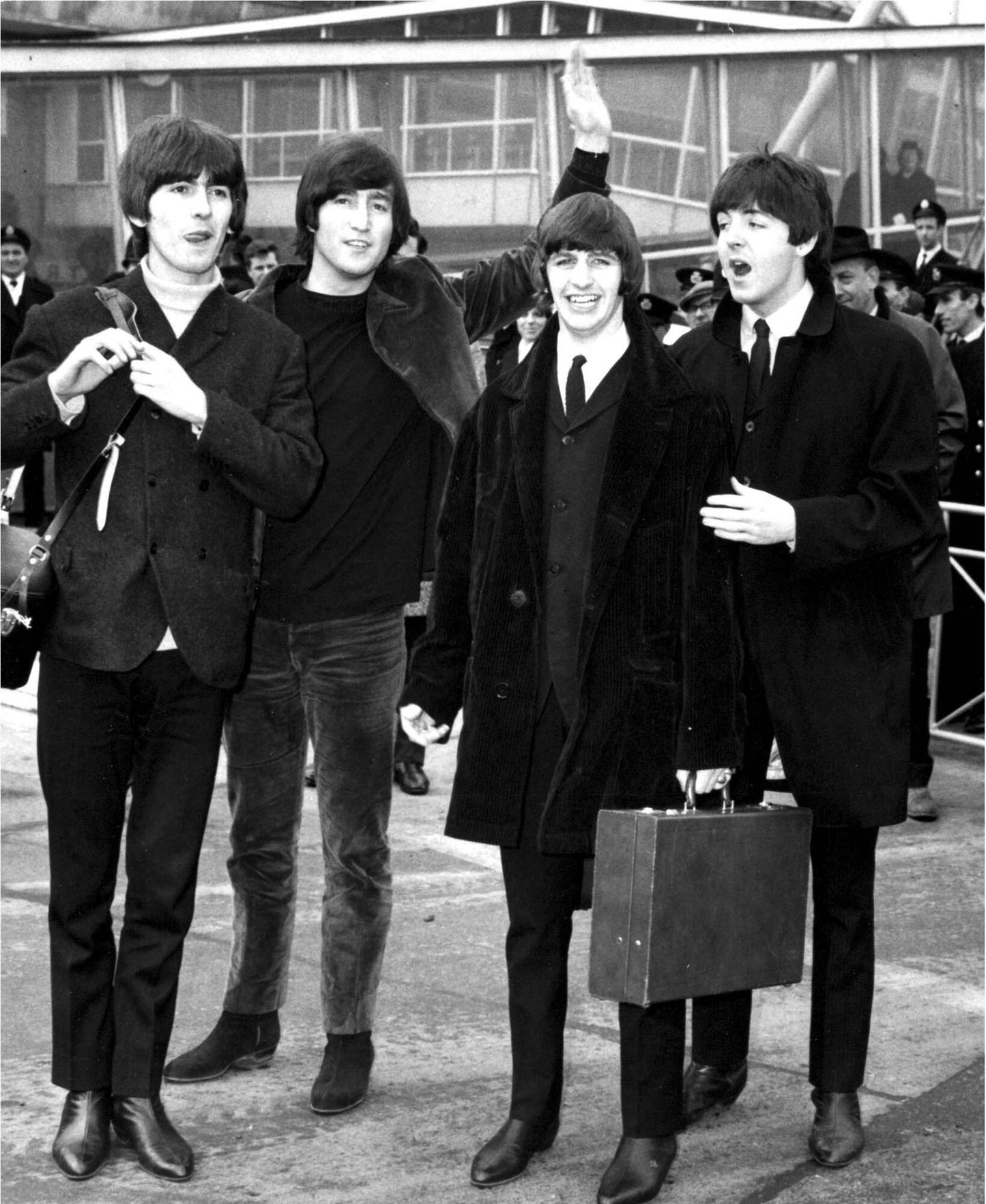 Black and white capture of the Beatles leaving for the Bahamas from the London Airport, circa 1965.