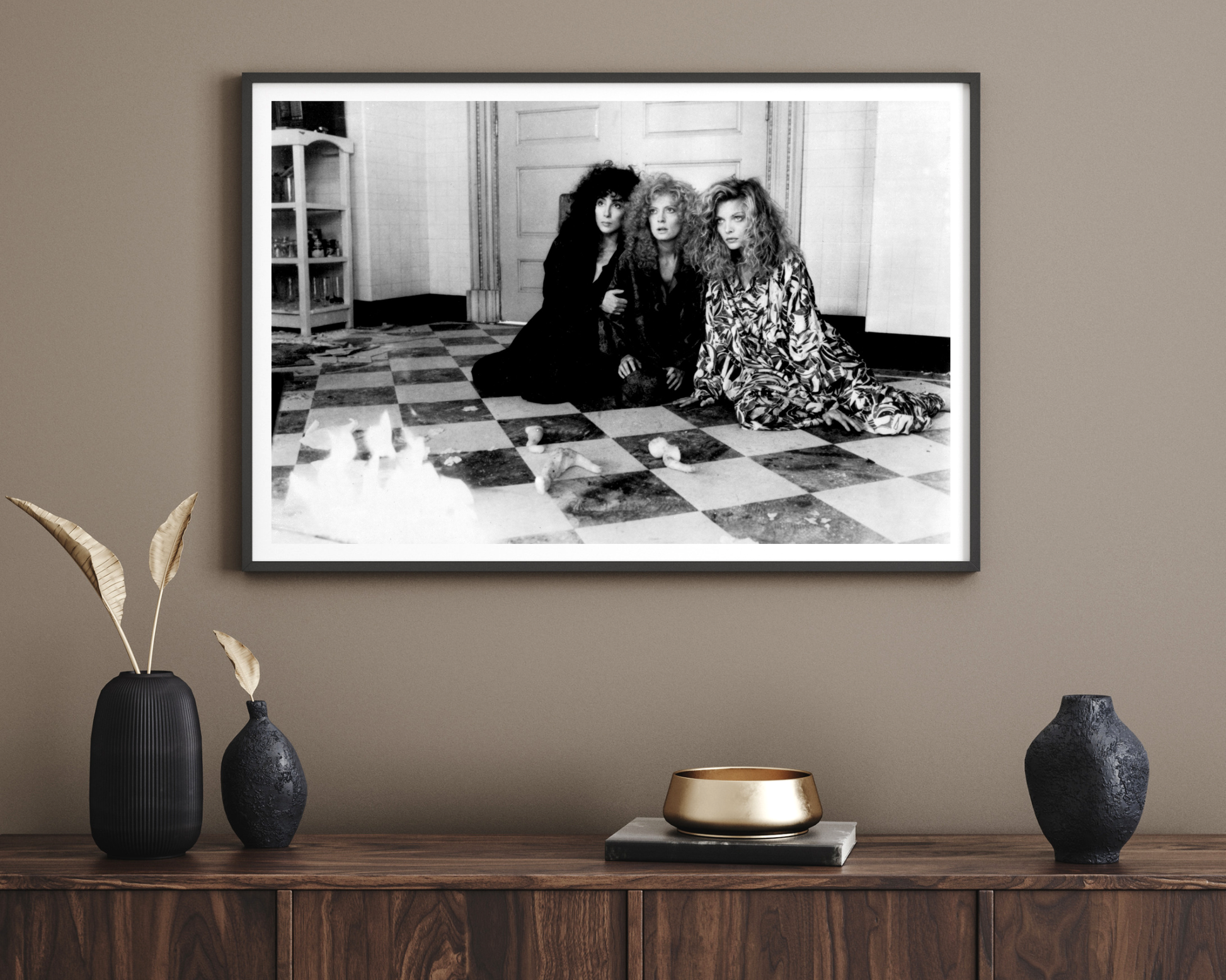 Black-and-white still from The Witches of Eastwick (1987) featuring Cher, Susan Sarandon, and Michelle Pfeiffer in a tense, supernatural moment on a checkered kitchen floor. The trio portrays three women who discover their magical powers after encountering a mysterious stranger.