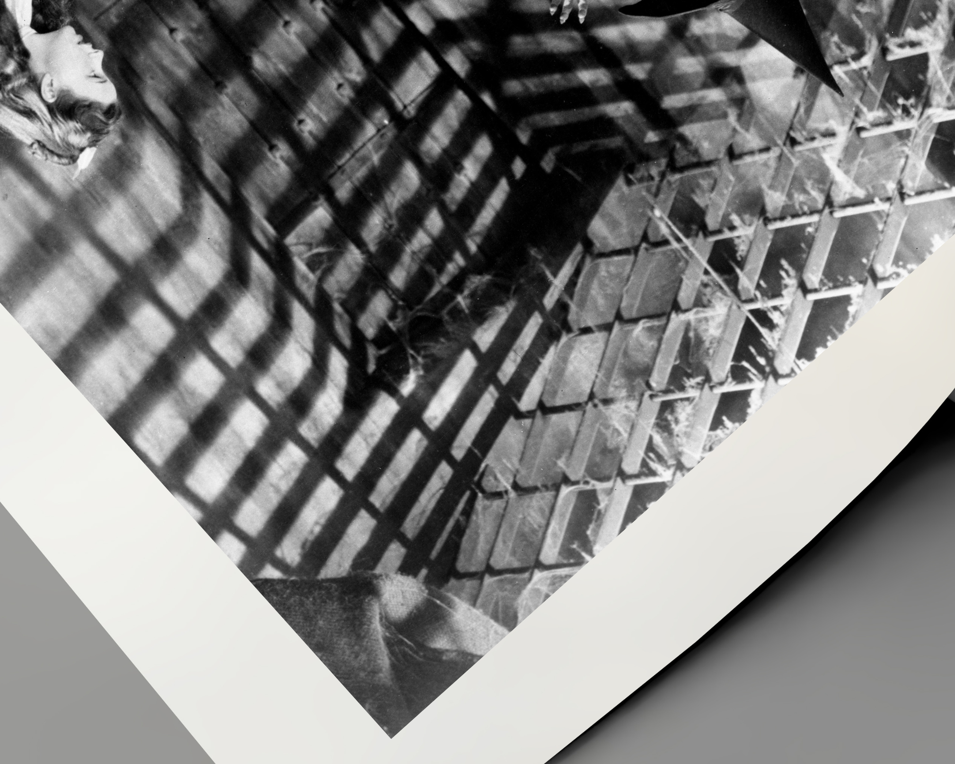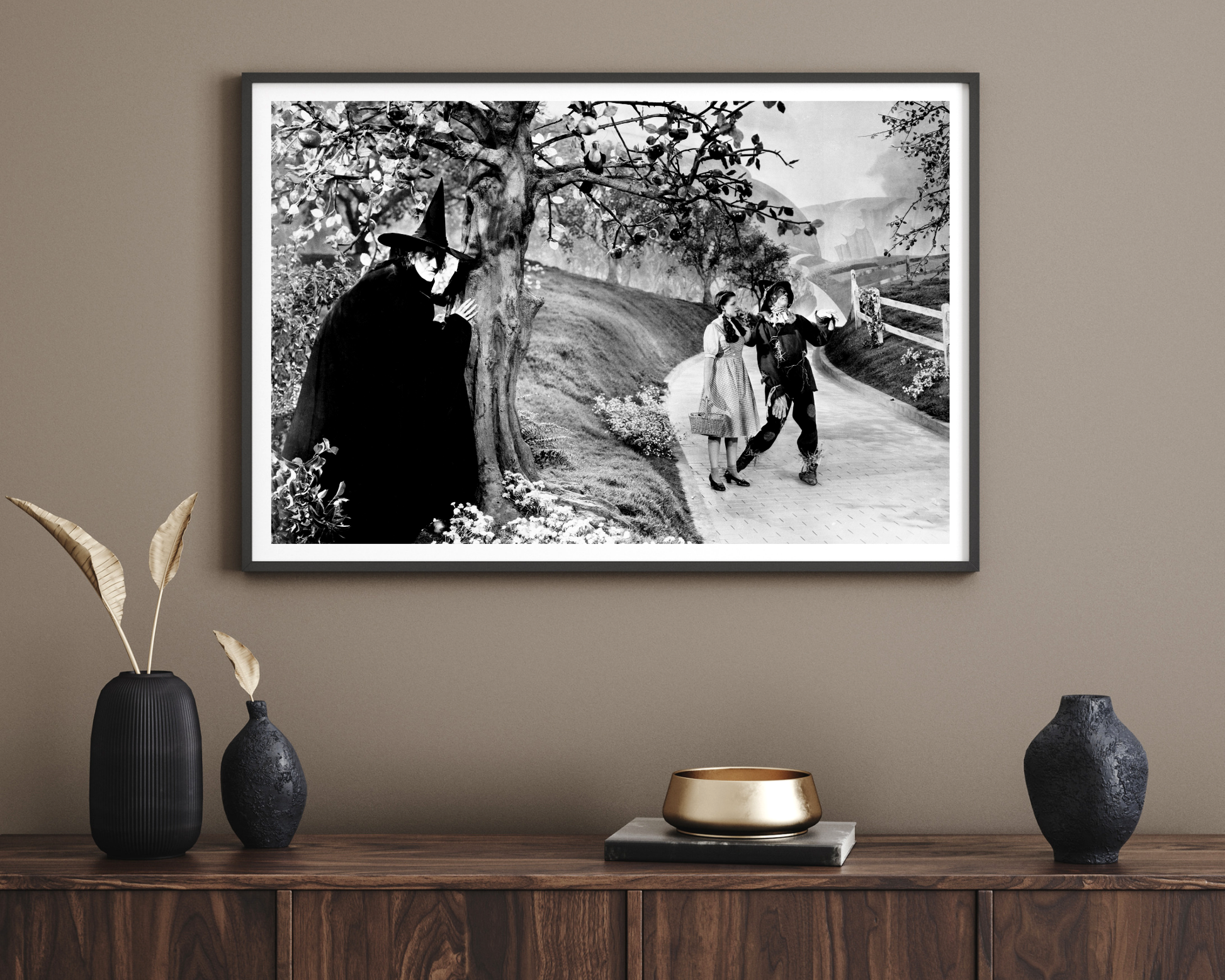 Black-and-white still from The Wizard of Oz (1939) featuring the Wicked Witch of the West confronting Dorothy in a tense scene filled with dramatic lighting and shadow. The set’s eerie details and expressive performances capture one of the film’s most unforgettable moments.