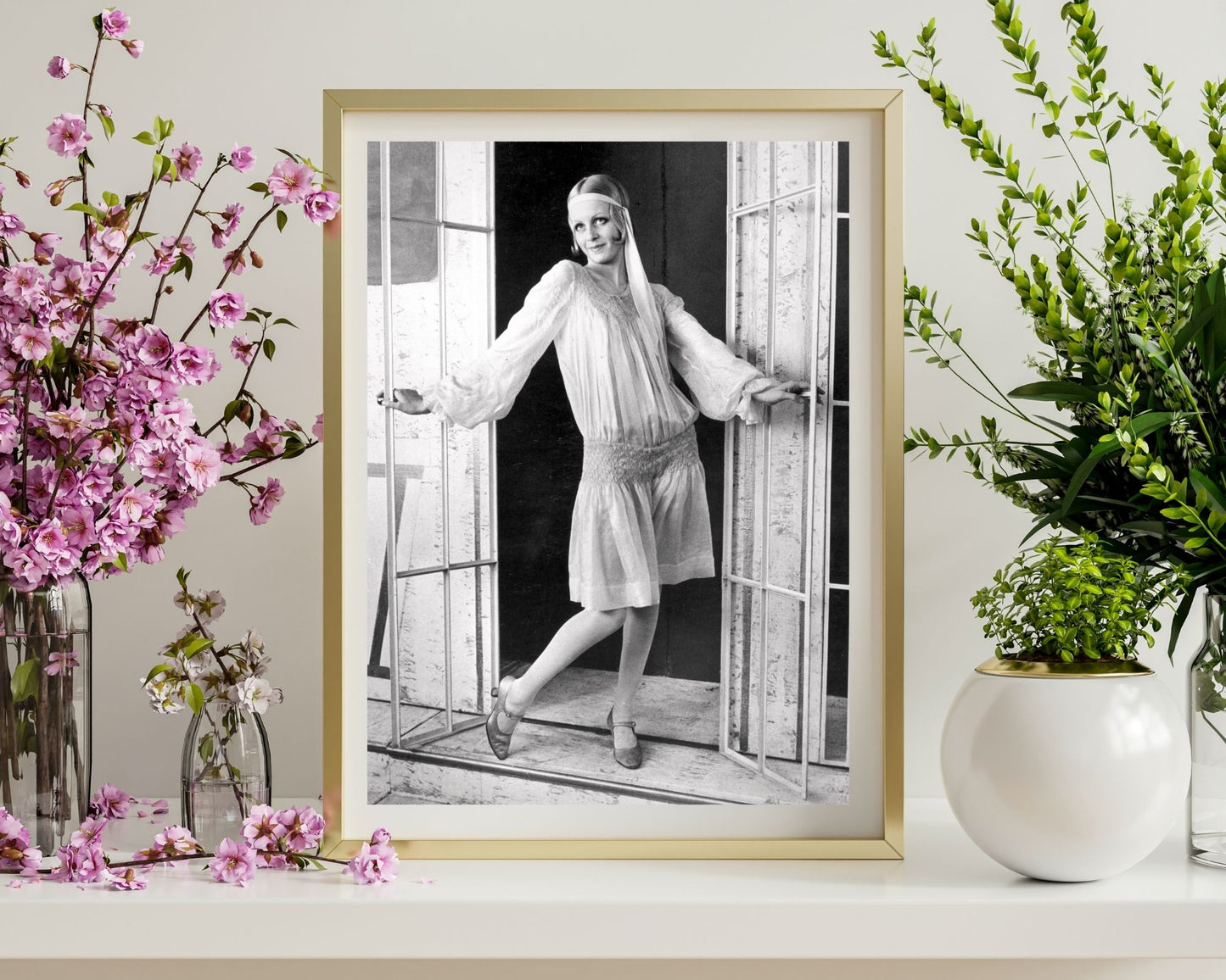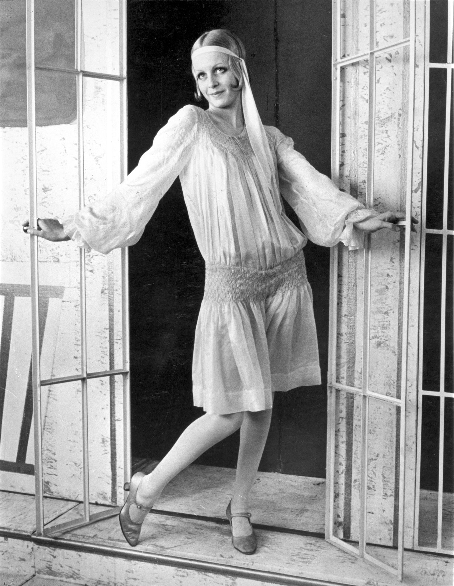 This mod portrait features Twiggy posed full-length in a doorway, smiling with arms extended.
